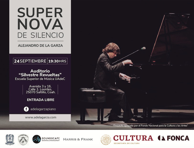 La Escuela Superior de Música de la Universidad Autónoma de Coahuila, invita a la comunidad universitaria y público en general, a disfrutar de “Supernova de Silencio” del pianista Alejandro de la Garza, el próximo martes 24 de septiembre.