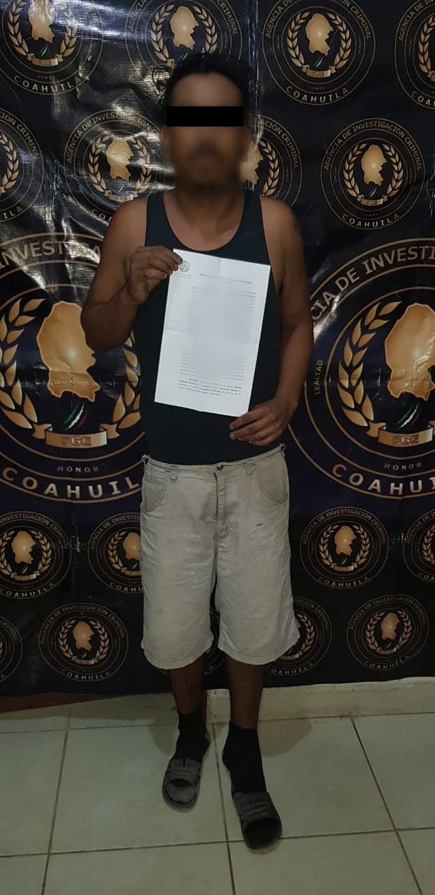 Sabinas, Coah.- Elementos de la Agencia de Investigación Criminal de la Región Carbonífera detuvieron en el municipio de Múzquiz a Carlos Alberto “N” por existir en su contra una orden de aprehensión por el delito de privación de la vida de la víctima cometido en contra de una persona del sexo masculino identificado como Luis Gerardo “N” de 36 años de edad.