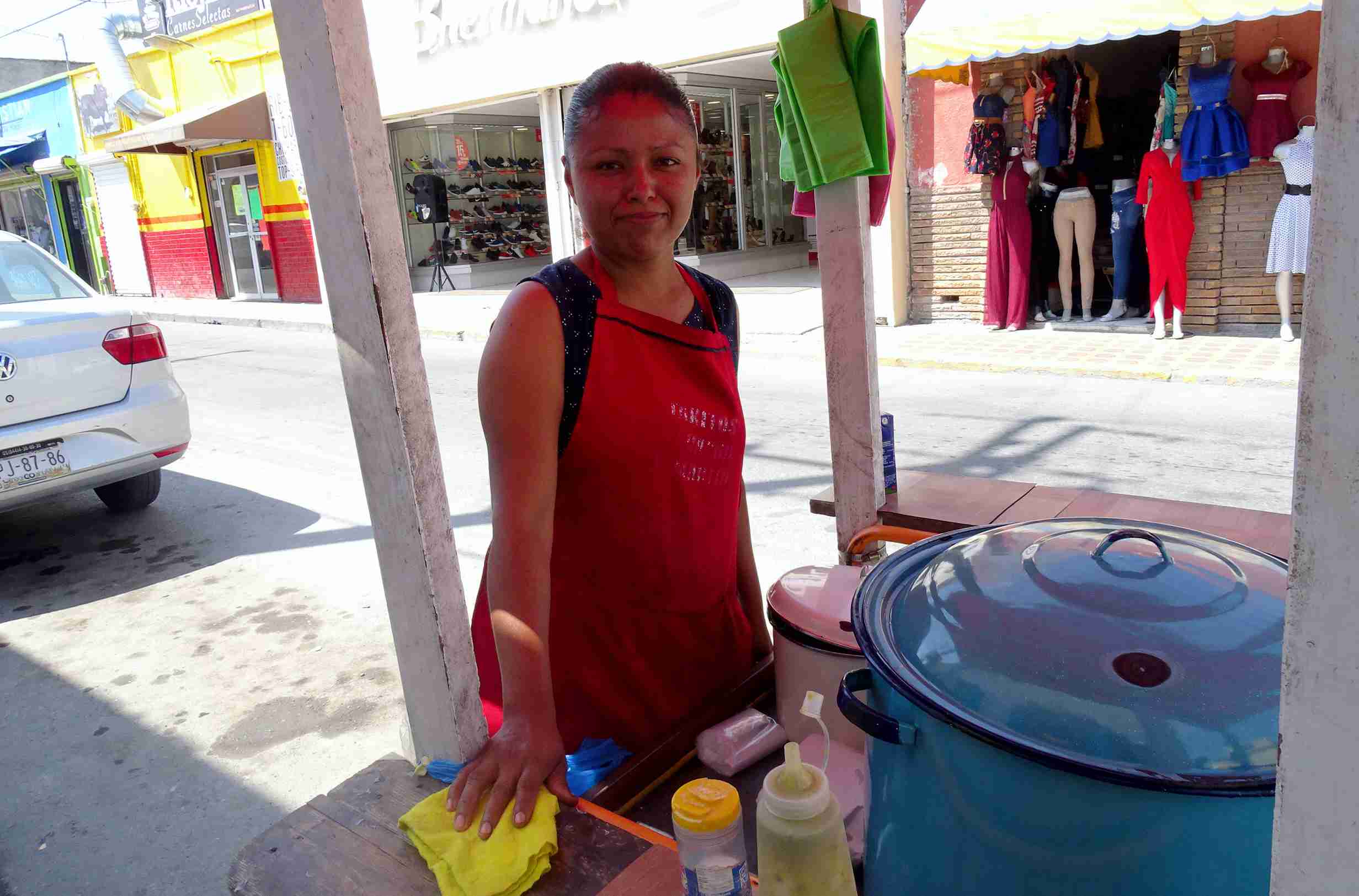 Por dos años, “doña Paty” ha trabajado en este negocio gastronómico improvisado, ella gana $200 pesos por día, la venta es buena porque al dar las 12:00 del mediodía se terminan todos los tacos de la vaporera. Entre su timidez, platica mientras guarda los sobrantes, que tiene tres hijos uno de 16 años, otro de ocho años y una niña de cuatro de nombre Ximena, la pequeña es quien la acompaña a la venta de los tacos, su esposo es trabajador de una empresa tarimera, y para solventar los gastos diarios de la casa, doña Paty decidió trabajar.