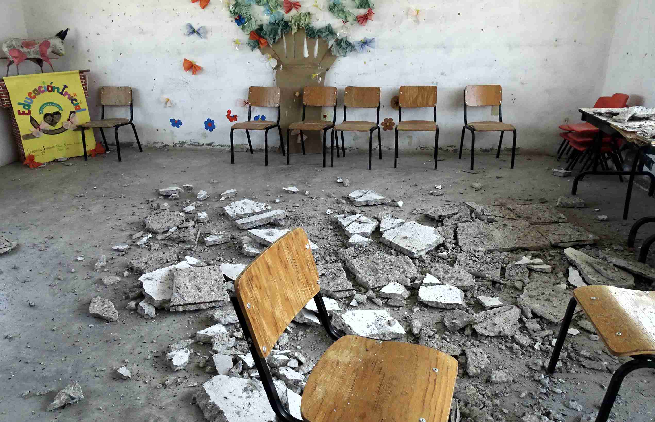Otra de las infraestructuras con un daño severo es el Preescolar CONAFE 20 de noviembre, ahí los dos salones están en riesgo de colapso lo que representa un peligro para los niños, quienes este jueves tuvieron que realizar su jornada escolar a las afueras de los salones. (LESLIE DELGADO)