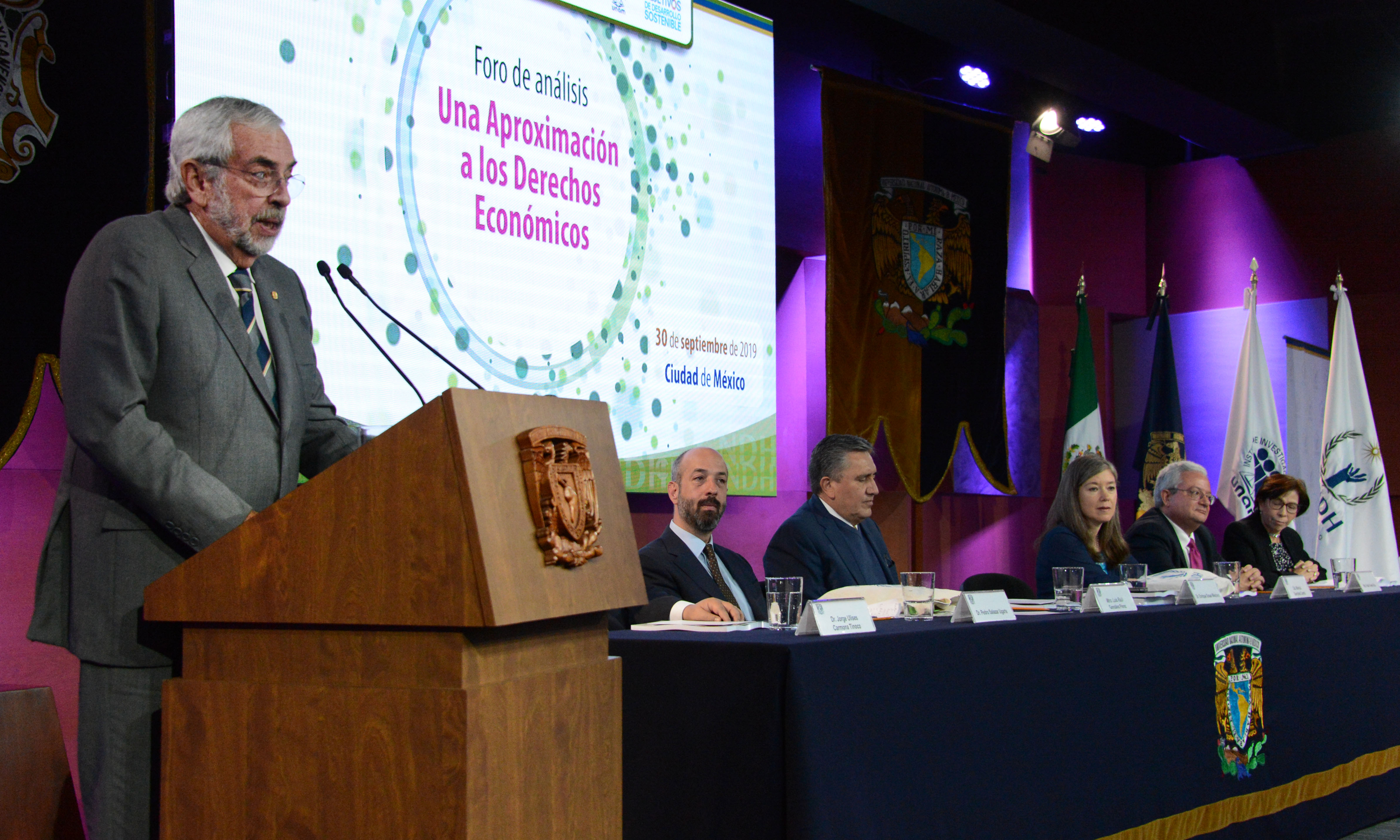 Graue destacó que la UNAM, a través de los institutos de Investigaciones Jurídicas (IIJ) y de Investigaciones Filosóficas, con el apoyo de la Comisión Nacional de los Derechos Humanos y la Comisión Económica para América Latina y el Caribe (CEPAL), elaboraron el documento “Derechos económicos: una aproximación conceptual”, que aborda los fundamentos de los derechos económicos, y la necesidad de que vivir sin carencia económica sea un derecho humano adicional.