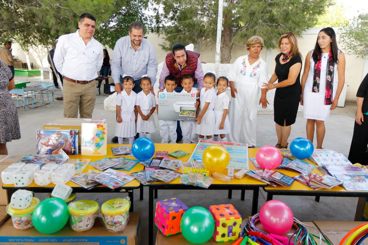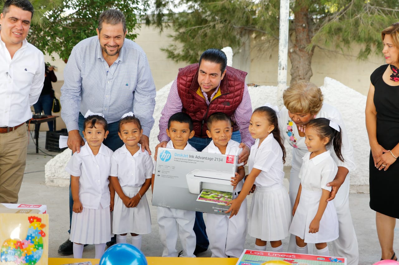 José María Morales Padilla, alcalde de Ramos Arizpe, acompañado de Alejandro González, Secretario de Ayuntamiento; Tomás Gutiérrez, secretario de Desarrollo Social y la profesora Adelaida Gutiérrez, Directora de Educación se presentaron en el Jardín de Niños Rubén Moreira Cobos de la colonia Analco II para hacer entrega del programa «Escuelas al 50».