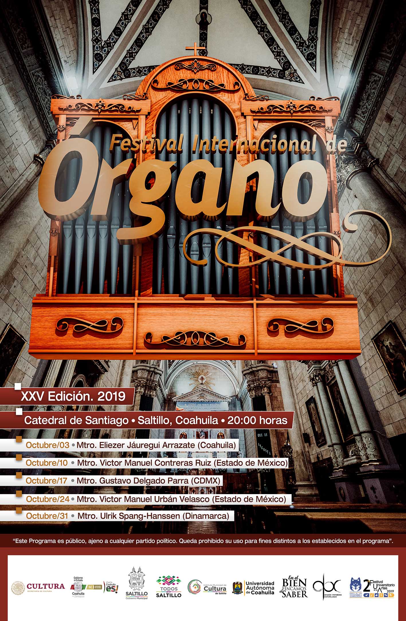 La Universidad Autónoma de Coahuila a través de la Coordinación General de Difusión y Patrimonio Cultural invita al Festival Internacional de Órgano, que en esta ocasión celebra 25 Aniversario e inicia este jueves 3 de octubre.