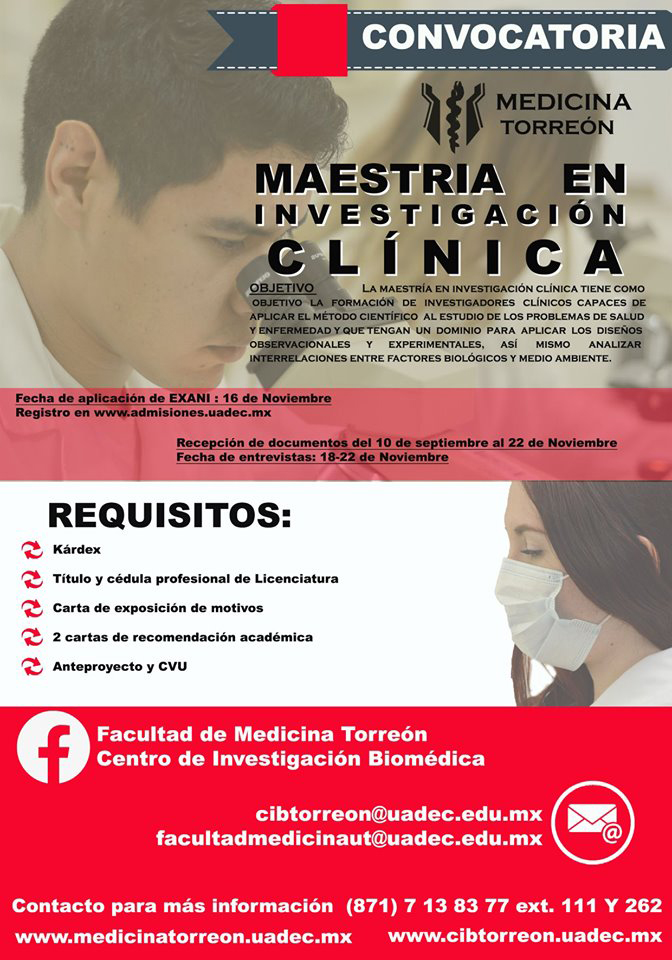Mientras que la maestría en Investigación Clínica tiene como objetivo la formación de investigadores clínicos capaces de aplicar el método científico al estudio de los problemas de salud y enfermedad y que tengan dominio para aplicar los diseños observacionales y experimentales, así mismo analizar interrelaciones entre factores biológicos y medio ambiente.