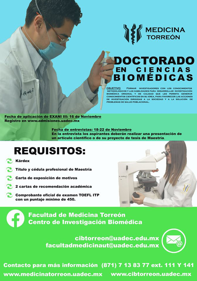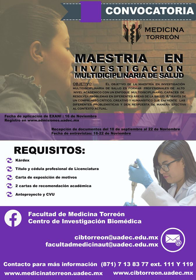 Para más información comunicarse al teléfono (871) 7 13 83 77 extensión 111 y 141, escribir a los correos cibtorreon@uadec.edu.mx y facultadmedicinaut@uadec.edu.mx o visitar las páginas www.medicinatorreon.uadec.mx y www.cibtorreon.uadec.mx . (EL HERALDO)