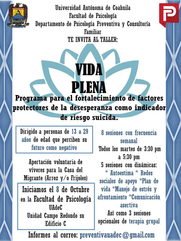 Con el compromiso de contribuir con la comunidad, la Facultad de Psicología de la Universidad Autónoma de Coahuila, invita al taller “Vida Plena” Programa para el Fortalecimiento de Factores Protectores de la Desesperanza como Indicador de Riesgo Suicida.