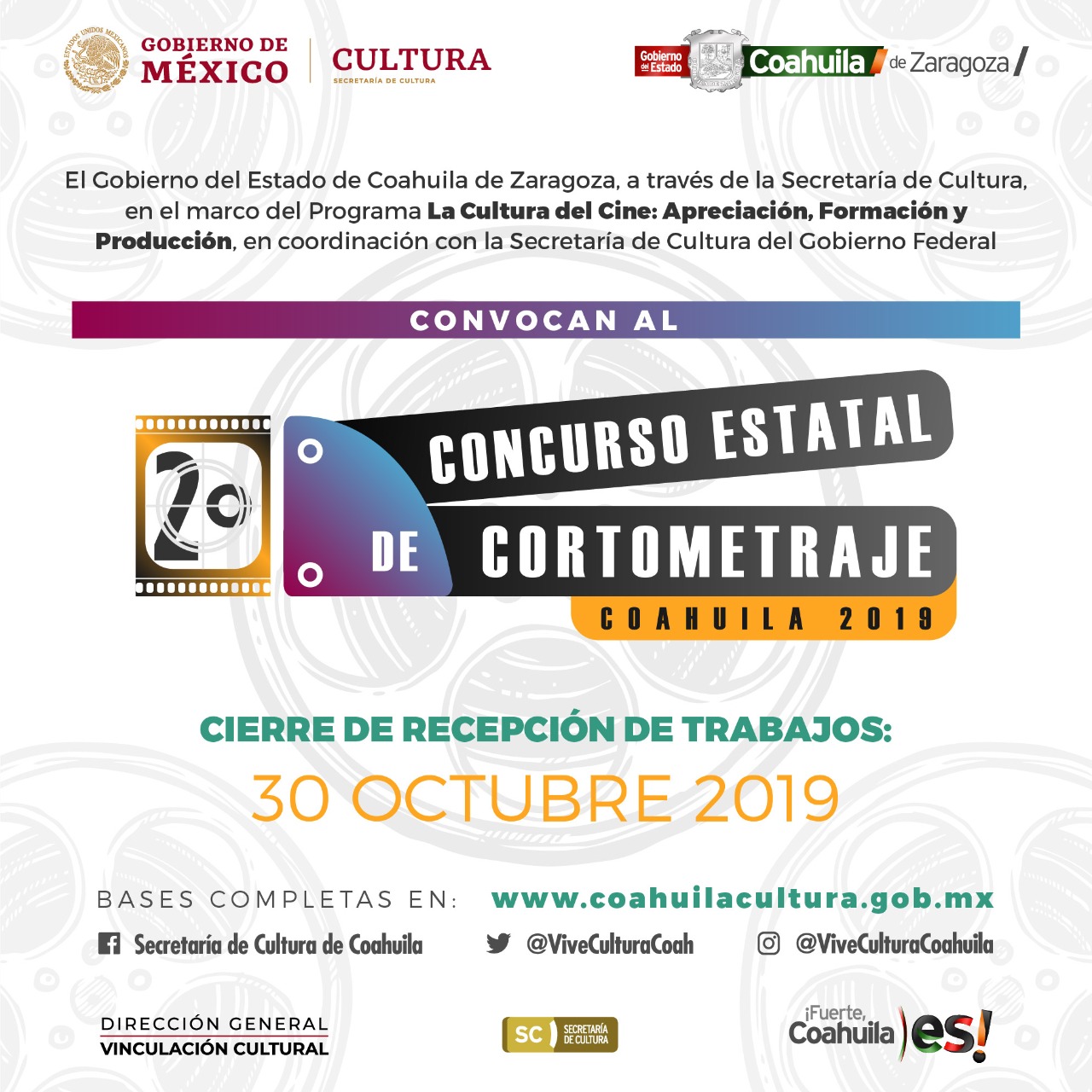 El Gobierno del Estado de Coahuila, a través de la Secretaría de Cultura (SC), en el marco del programa La Cultura del Cine: Apreciación, Formación y Producción, en coordinación con la Secretaría de Cultura del Gobierno Federal, convocan al II Concurso Estatal de Cortometraje Coahuila 2019.