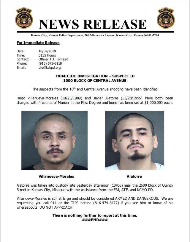 Según la imagen, Alatorre fue detenido el domingo cerca de Quincy Street, en Kansas. Villanueva-Morales aún se encuentra prófugo; las autoridades lo consideran peligroso y estiman que se encuentra armado.