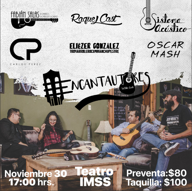 El colectivo «Encantautores», integrado por compositores que buscan colocar su propuesta en el gusto del público, ofrecerán este próximo 30 de noviembre un concierto en el Teatro del IMSS (Manuel Doblado 660. Centro Histórico), a partir de las 5:00 de la tarde, para el cual ya está disponible su preventa en su página de Facebook que lleva el mismo nombre.