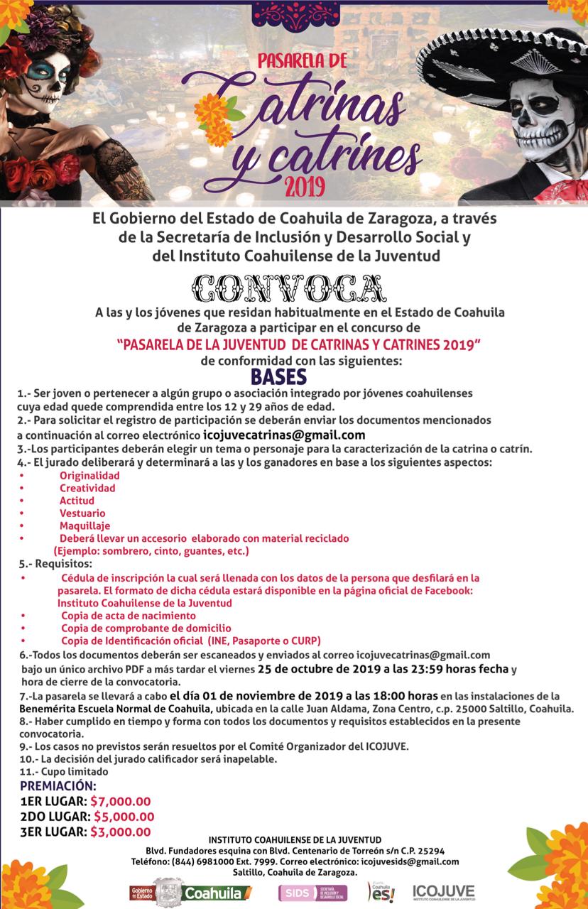 Como parte de las actividades en conmemoración del Día de Muertos, el Gobierno del Estado de Coahuila, a través del Instituto Coahuilense de la Juventud (ICOJUVE), convoca a participar en el concurso «Pasarela de Catrinas y Catrines 2019”.