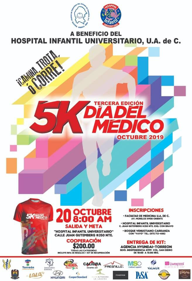 Torreón.- La Facultad de Medicina Unidad Torreón de la Universidad Autónoma de Coahuila, el Colegio de Pediatras de Coahuila y Carreras Laguna, invitan a la comunidad en general a participar en la Tercera Edición de la Carrera 5K Día del Médico, que se realiza a beneficio del Hospital Infantil Universitario.