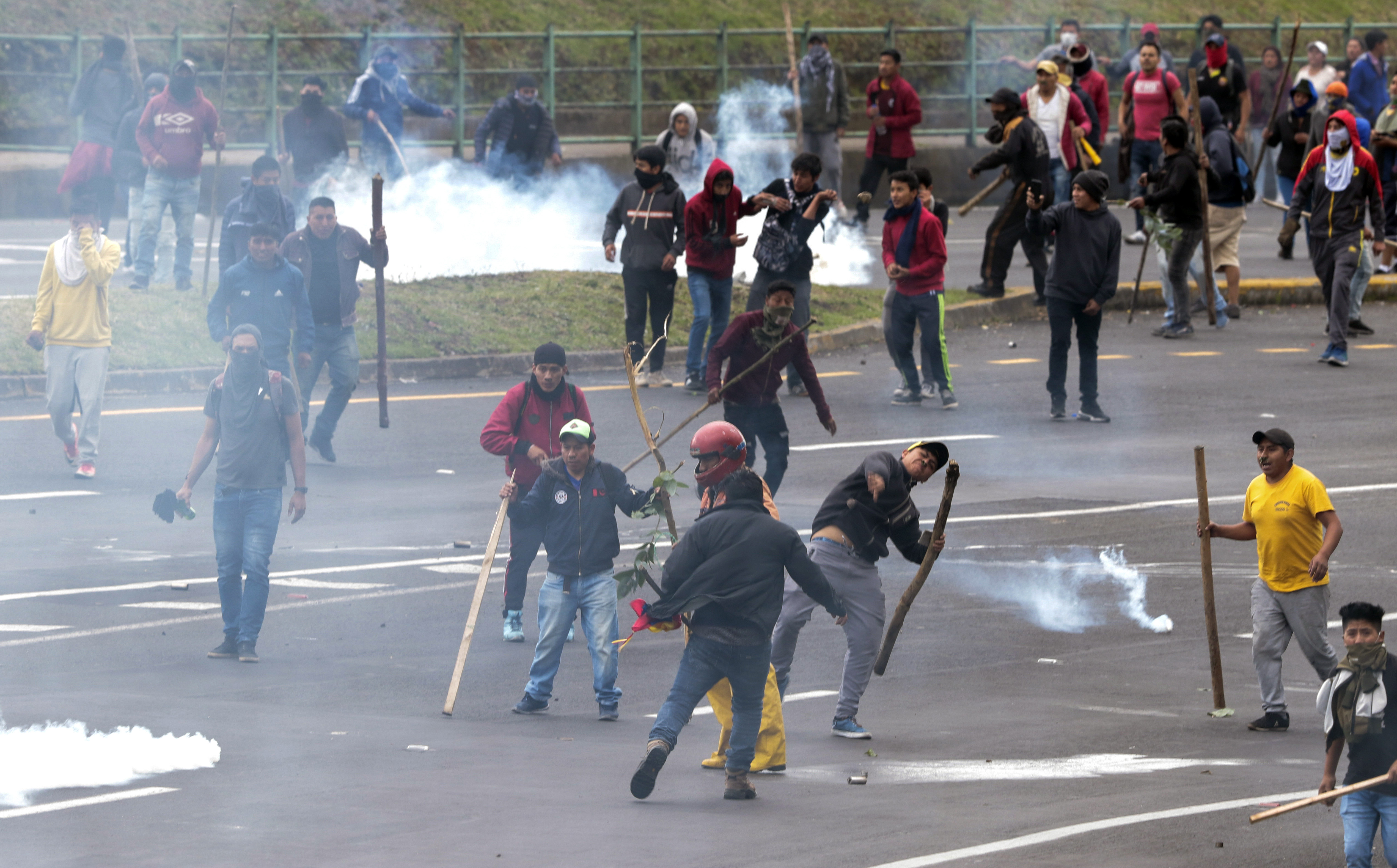 Quito fue escenario este lunes de fuertes disturbios entre manifestantes y militares y policías que, bajo un estado de excepción decretado por el Gobierno, buscan restablecer el orden.