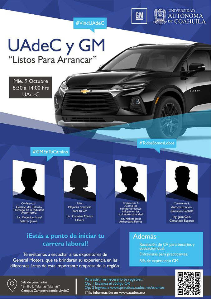 GM realizará entrevistas de trabajo a egresados interesados en formar parte de la empresa; entrevistas a alumnos que deseen hacer prácticas profesionales, y se exhibirán ocho vehículos emblema de la empresa automotriz.