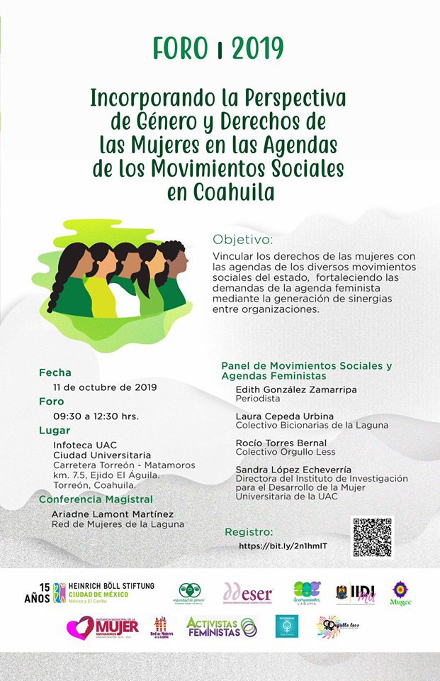 Torreón.- El Instituto de Investigación para el Desarrollo Integral de la Mujer Universitaria de la Universidad Autónoma de Coahuila invita a participar en el Foro “Incorporando la Perspectiva de Género y Derechos de las Mujeres en las Agendas de los Movimientos Sociales en Coahuila”, que se llevará a cabo el 11 de octubre de 2019.