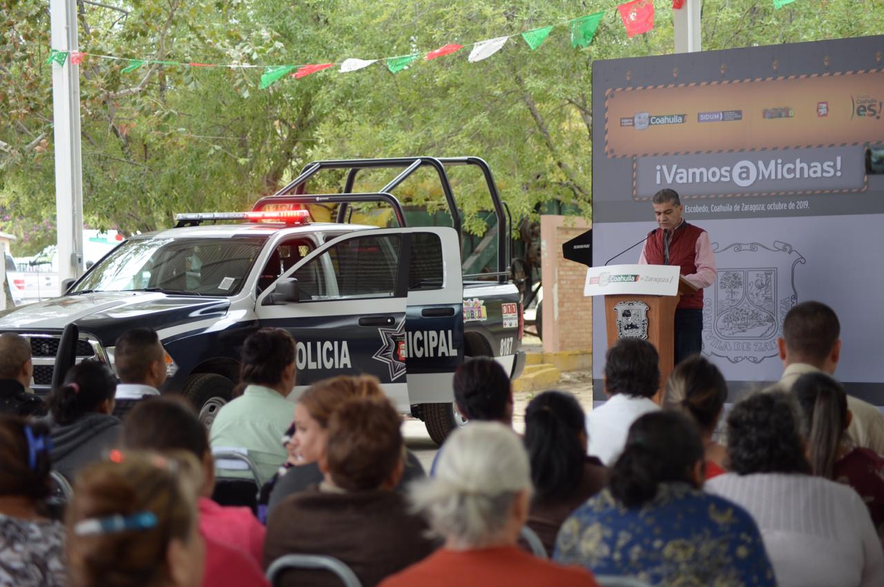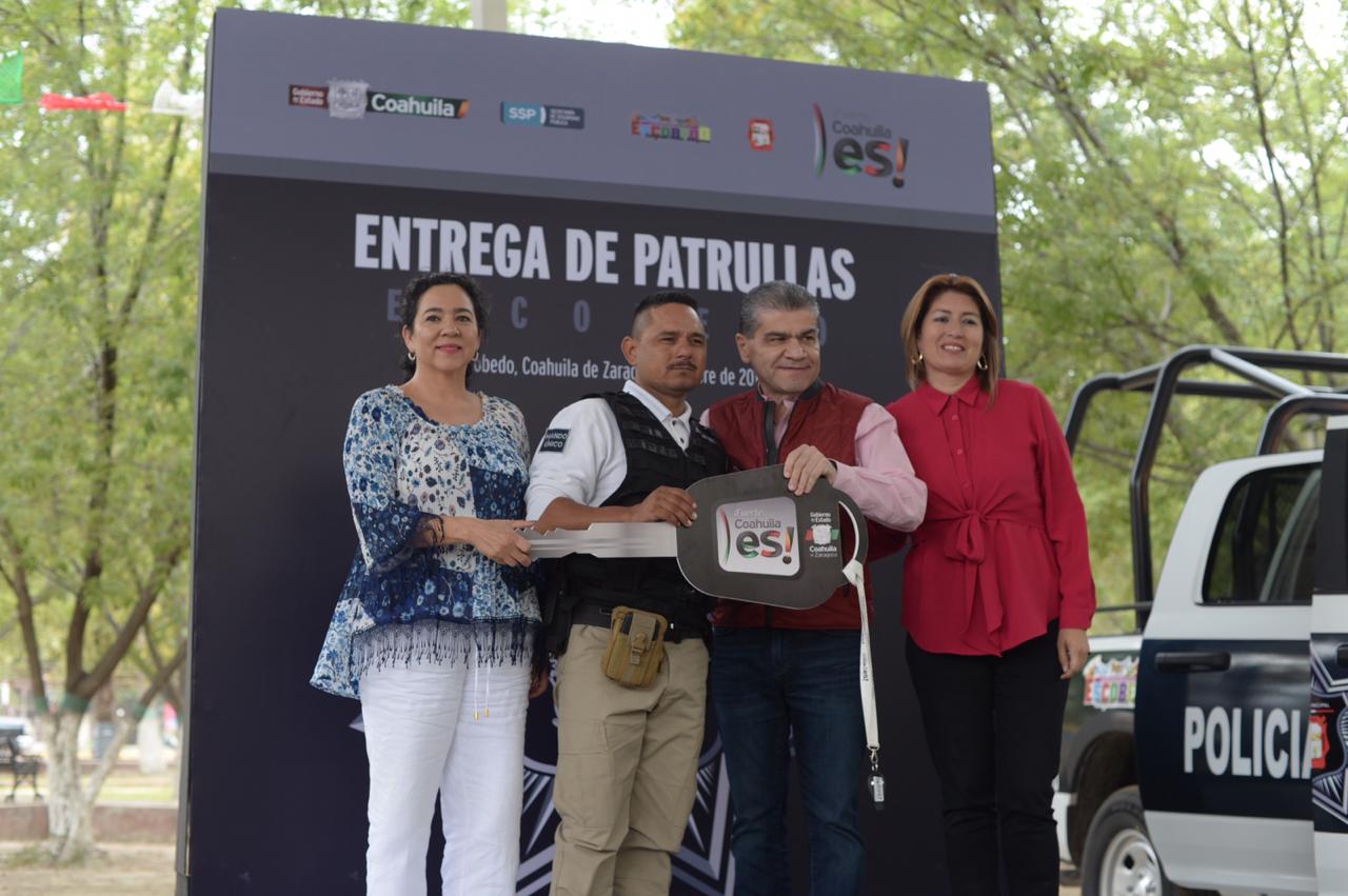Escobedo, Coahuila.- La seguridad pública es una prioridad en la Administración estatal, por ello el gobernador Miguel Ángel Riquelme Solís hizo entrega de dos patrullas totalmente equipadas para garantizar la cobertura en vigilancia del Municipio de Escobedo y sus comunidades.