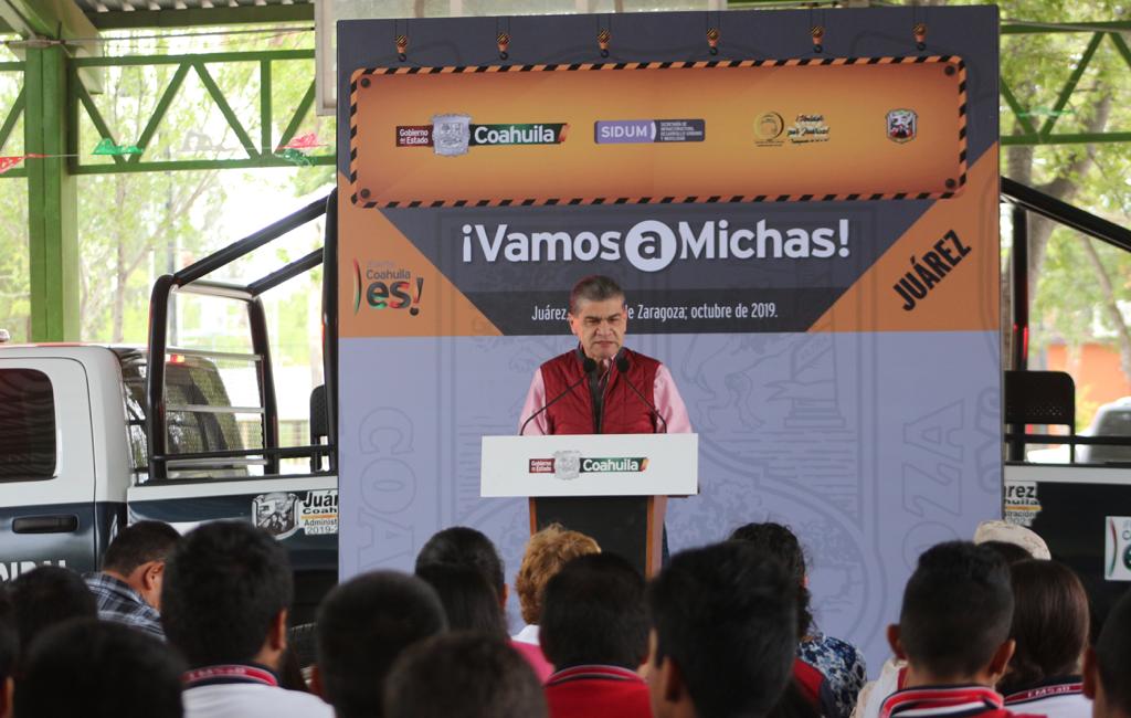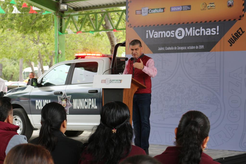 Juárez, Coahuila.- Como parte de una gira de trabajo que inició en Juárez, el gobernador Miguel Ángel Riquelme Solís puso en marcha en este municipio acciones de mejora urbana mediante la pavimentación de espacios públicos e iluminación, entre otras acciones dentro del Programa “Vamos a Michas”, donde Estado y Municipio invierten 6.5 millones de pesos en conjunto.
