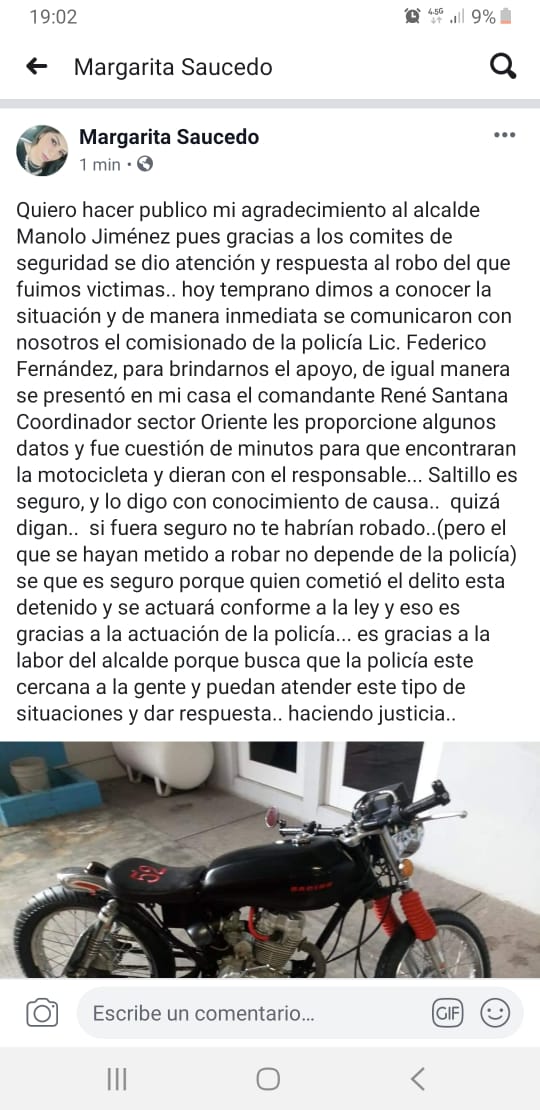 Margarita Saucedo, usuaria de Facebook, hizo público su agradecimiento al alcalde Manolo Jiménez, ya que gracias a los comités ciudadanos de seguridad se le brindó atención y respuesta al robo de una motocicleta.