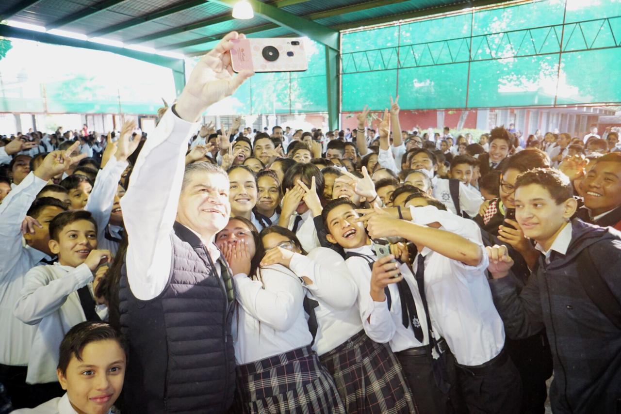 Torreón.- El gobernador Miguel Ángel Riquelme Solís estuvo de visita en la Escuela Secundaria Técnica No. 1 “Profesor Idelfonso Villarello Vélez”, y anunció que en breve comenzarán las acciones para rehabilitar el acceso y estacionamiento, y equipará 6 aulas con minisplits y mobiliario, mientras que este lunes entregó 25 computadoras.
