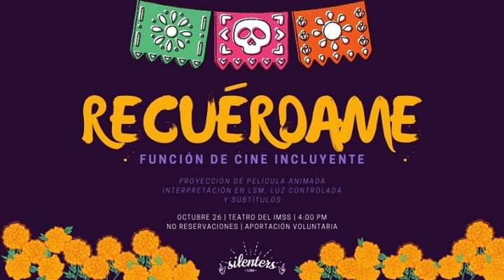 Los alumnos del Taller de Lengua de Señas, realizado por la iniciativa educativa Silenters, ofrecerán al público en general, este próximo sábado a las 4:00 de la tarde, en el Teatro del IMSS (Manuel Doblado 660. Centro Histórico), la función de cine animado e incluyente «Recuérdame», que contará con adaptación de luz controlada para débiles visuales, interpretación con lengua de señas mexicana y subtítulos.