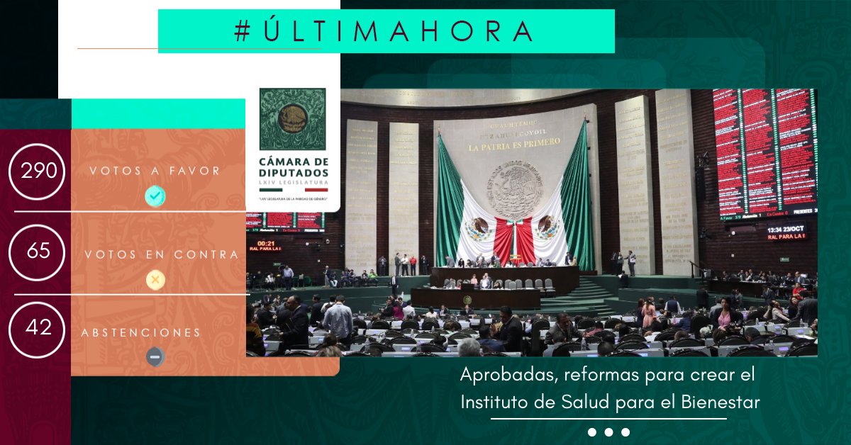 Con 290 votos a favor, 65 en contra y 42 abstenciones el Pleno de la Cámara de Diputados aprobó, en lo general, el dictamen que reforma la Ley General de Salud y la Ley de los Institutos Nacionales de Salud, para crear el Instituto de Salud para el Bienestar (Insabi).