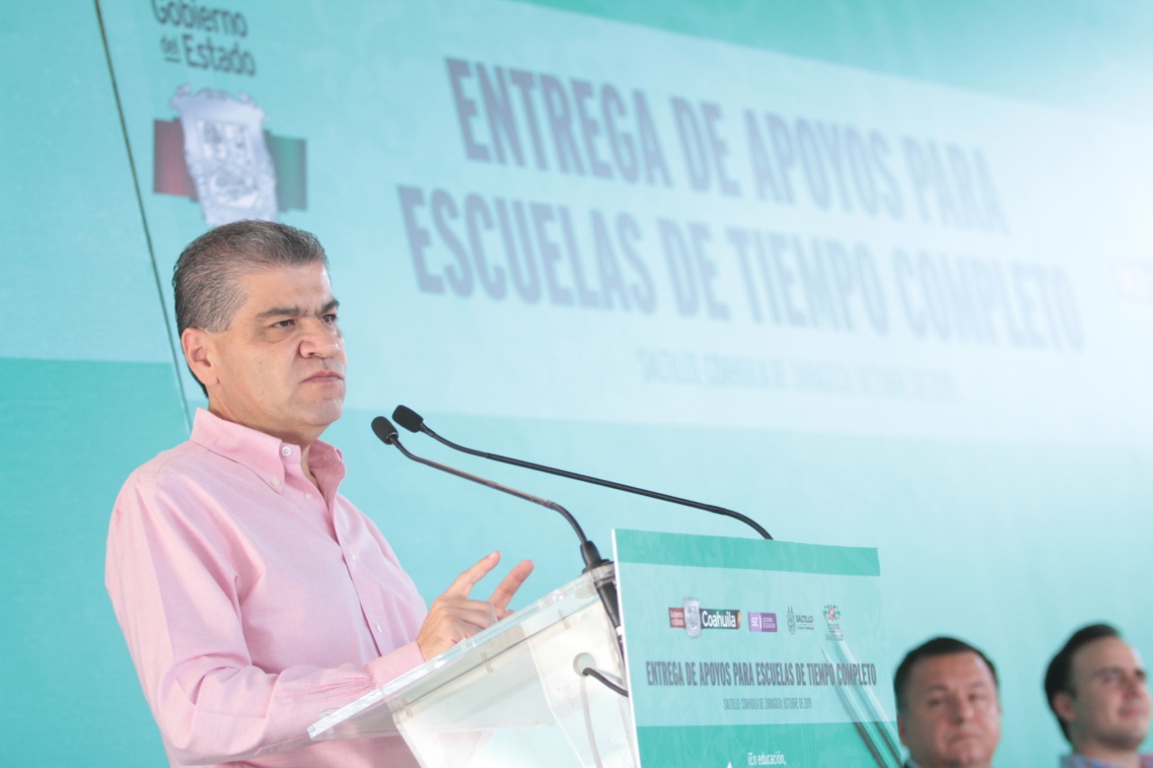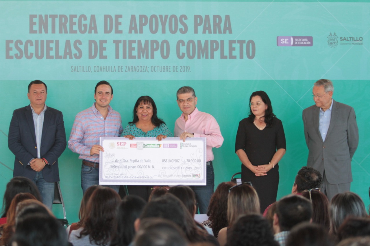 En beneficio de 86 mil 700 estudiantes de Coahuila, el gobernador Miguel Ángel Riquelme Solís realizó la entrega simbólica de recursos por 46 millones 850 mil pesos a 650 Escuelas de Tiempo Completo.
