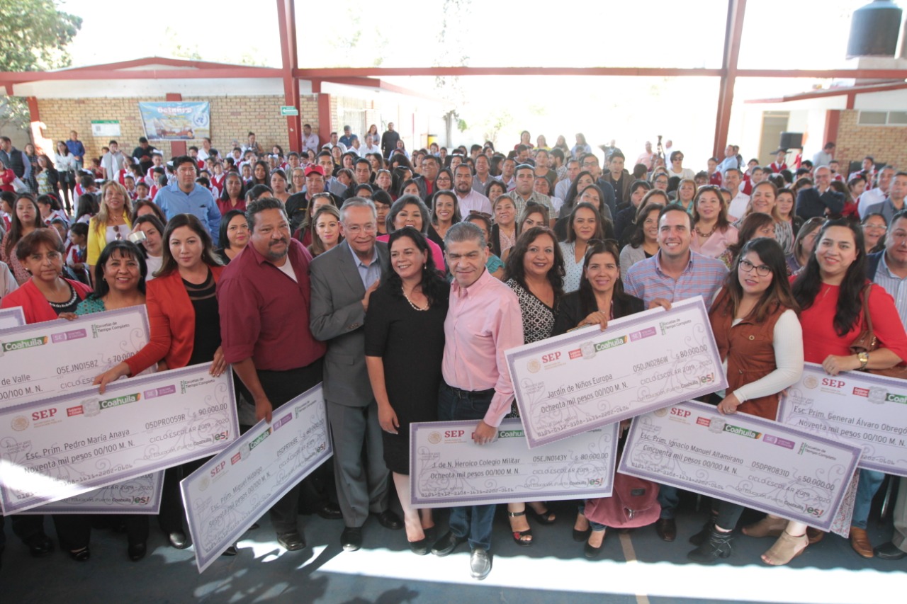 En la Escuela Primaria Federal Profesora “Emilia Hilario Valerio”, de la Ciudad de Saltillo, el Mandatario estatal entregó 10 cheques de manera simbólica a los preescolares “Europa”, “Ramón López Velarde”, “Heroico Colegio Militar”, “Pepita de Valle”; a las Primarias “Pepita de Valle”, “Pedro María Anaya”, “Ignacio Manuel Altamirano”, “Miguel Hidalgo”, “General Álvaro Obregón” y la Secundaria “Francisco Villa”.