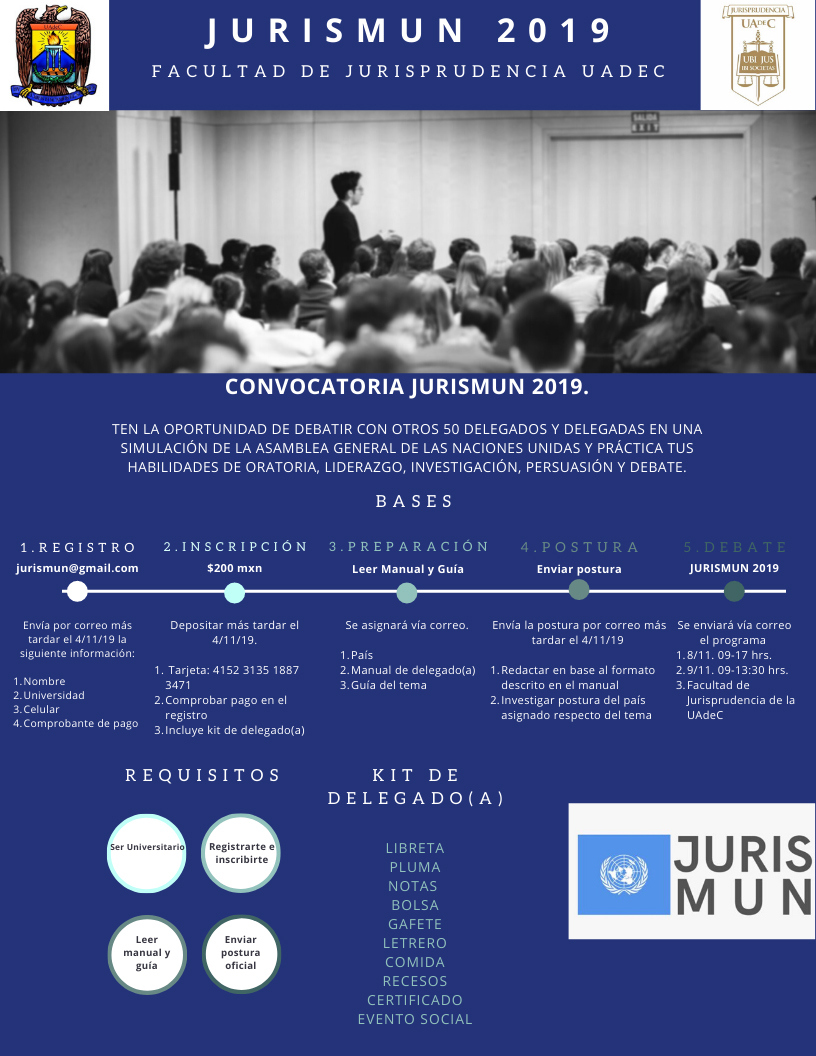 El próximo 8 y 9 de noviembre, estudiantes de la Facultad de Jurisprudencia de la Universidad Autónoma de Coahuila, e integrantes del Capítulo de la Asociación Internacional de Estudiantes de Derecho (The International Law Students Association ILSA), llevarán a cabo la Simulación de una Asamblea de la Organización de las Naciones Unidas.