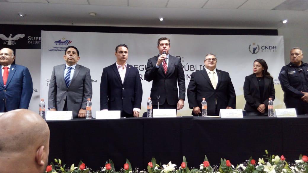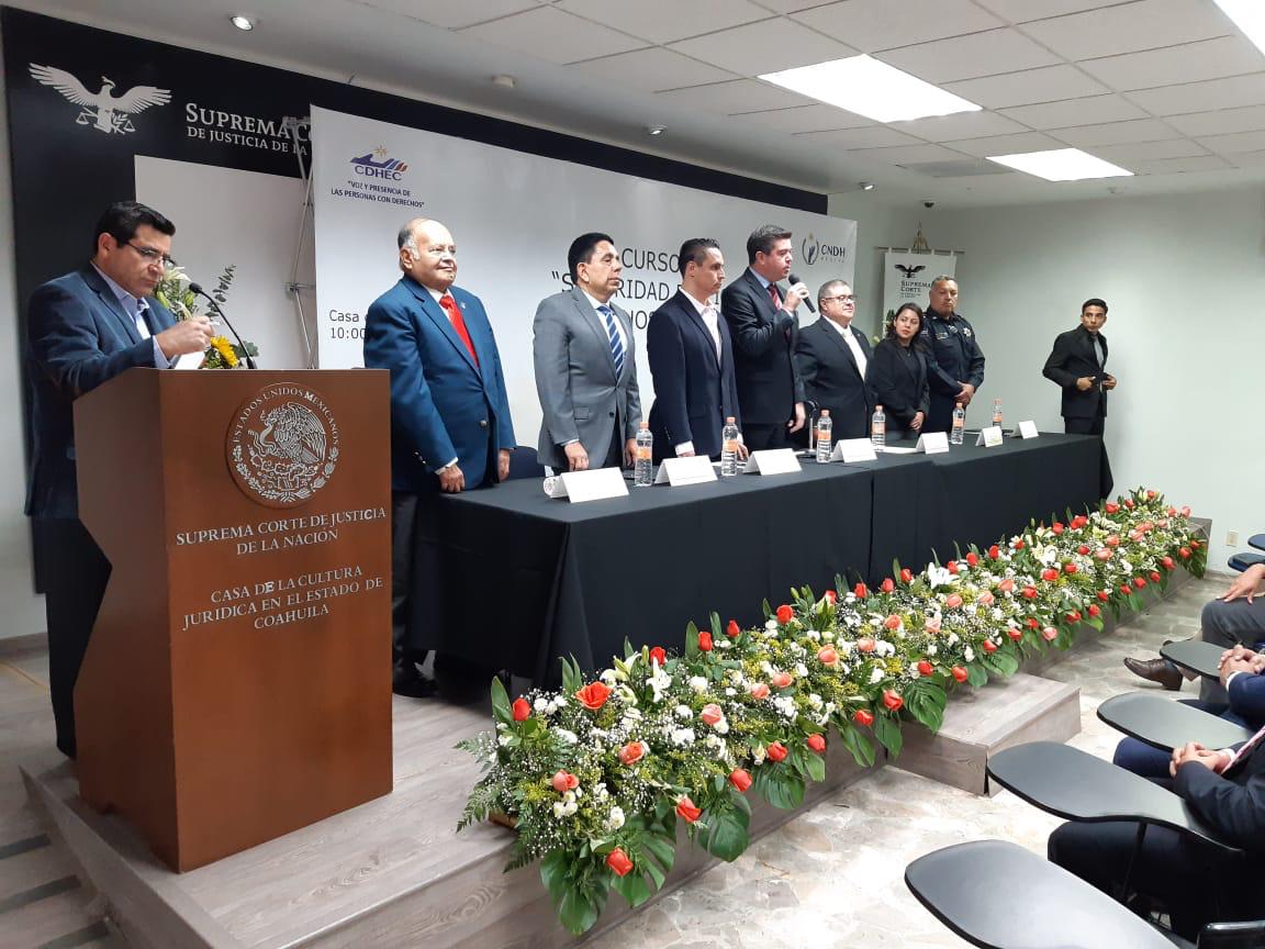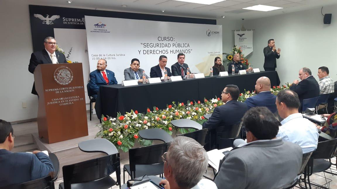 El Dr. Hugo Morales Valdés, Presidente de la CDHEC, inauguró este evento en presencia de José Luis Pliego Corona, Secretario de Seguridad Pública del Estado; Sergio Lara Galván, Secretario del Ayuntamiento de Torreón; Efraín Alonso Gastélum Padilla, Delegado de la Fiscalía General del Estado (FGE); Manuel Horacio Cavazos Cadena, Fiscal Especializado en Investigación de Delitos Cometidos por Agentes del Estado, y Gerardo Rodríguez García, Director de Operaciones de Seguridad Pública Municipal.