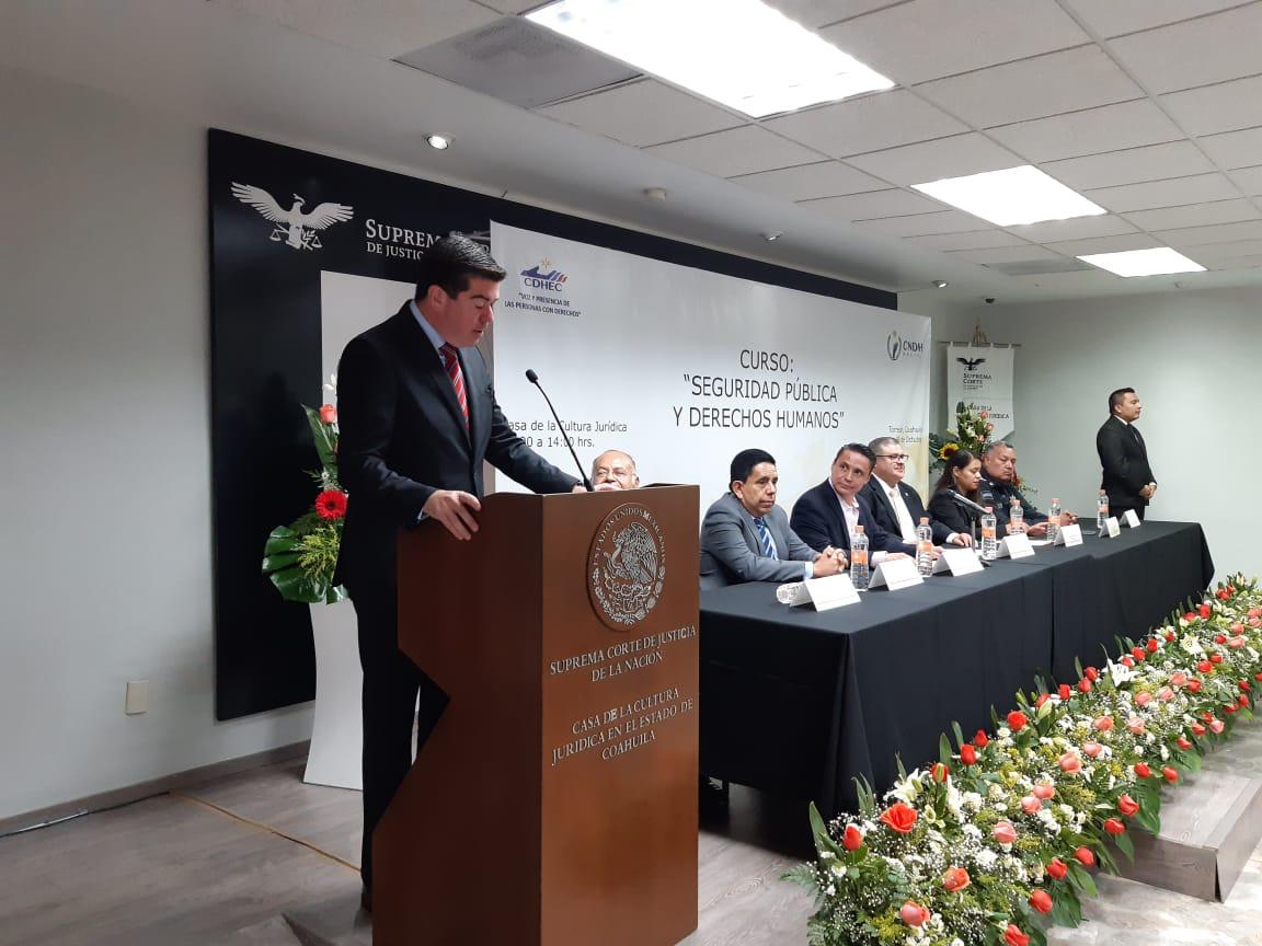 Torreón.- Como parte de la sensibilización, responsabilidad y profesionalismo con que deben desempeñarse los servidores públicos de contacto con la protección y seguridad del ciudadano, y de la estrategia de la Comisión de los Derechos Humanos del Estado de Coahuila (CDHEC) para garantizar, proteger, defender y difundir los derechos de los coahuilenses, se llevó a cabo este martes de 10:00 a 14:00 horas el curso “Derechos Humanos y Seguridad Pública” en esta ciudad, impartido en coordinación con la Secretaría Técnica del Consejo Consultivo de la Comisión Nacional de Derechos Humanos (CNDH).