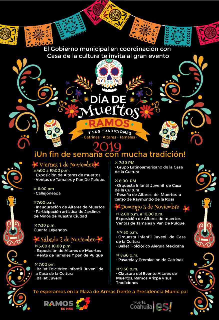 “Comenzaremos con la exposición de altares de muertos además de una callejoneada entre 6 y 7 de la tarde, actividad nueva que mostrara al visitante una explicación del Ramos Arizpe antiguo y lleno de historias, enseguida con nuestro alcalde a partir de las 7 de la noche se llevara a cabo la inauguración oficial”, explico Aarón Lopez Lomas, director de la casa de la cultura en Ramos Arizpe.