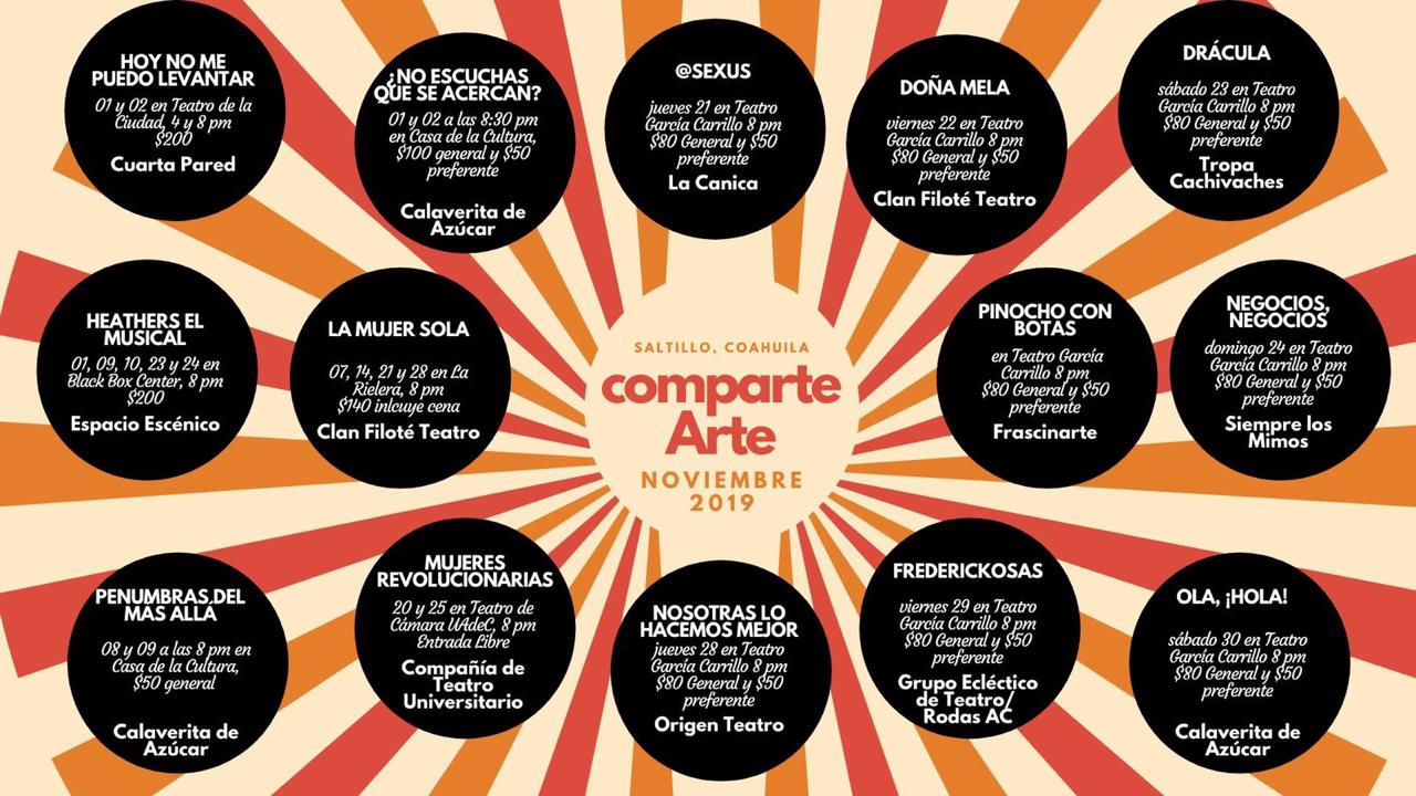 Durante el penúltimo mes del 2019, recintos de la localidad como el Centro Cultural Teatro García Carrillo (Aldama 315. Centro Histórico), Teatro de la Ciudad Fernando Soler y la Casa de la Cultura de Saltillo (Hidalgo 359. Centro Histórico), recibirán diversas propuestas escénicas para deleitar a los amantes de la dramaturgia.