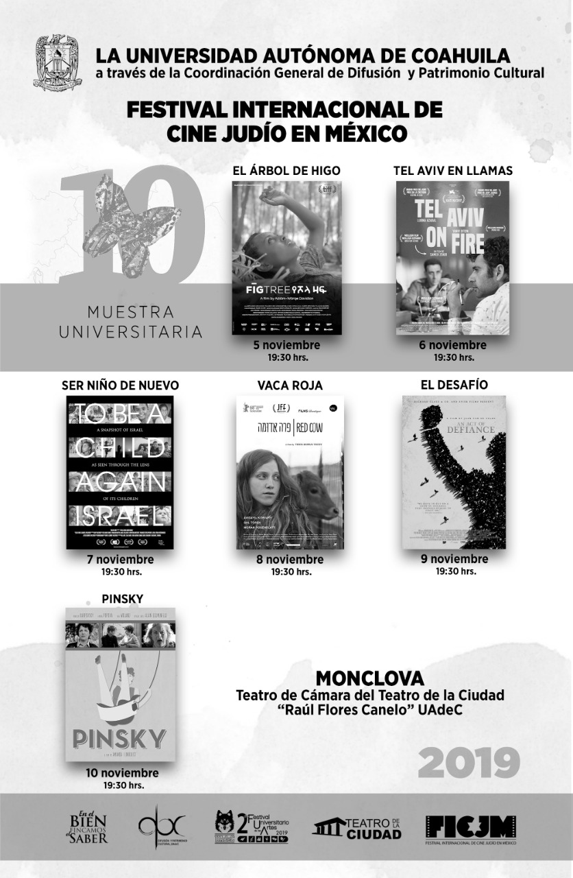 Monclova.- La Universidad Autónoma de Coahuila invita a la comunidad universitaria y al público en general a disfrutar de la Décima Muestra Internacional de Cine Judío en México que se estará realizando dentro de las actividades del Festival Universitario de las Artes UA de C 2019.