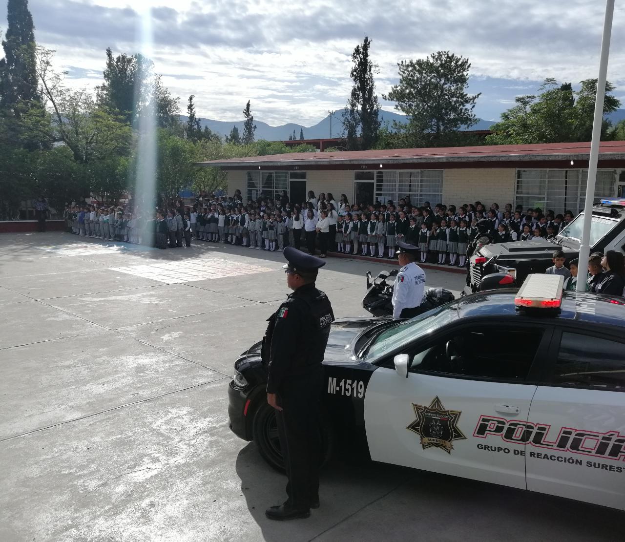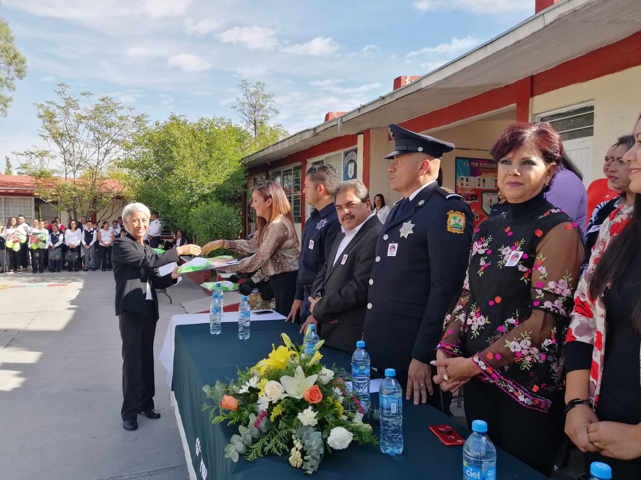 Servidores públicos de la Comisión de Seguridad y Protección Ciudadana, así como directores, alumnos y padres de familia de las escuelas Ignacio Zaragoza, Américas Unidas, Niños Héroes, Humberto Rubén Moreira, Federico Barrera Fuentes, Francisco Coss, Constituyentes y Narciso Mendoza en ambos turnos asistieron a la escuela Revolución de Ayutla a la ceremonia donde recibieron de forma representativa el equipo a utilizar.