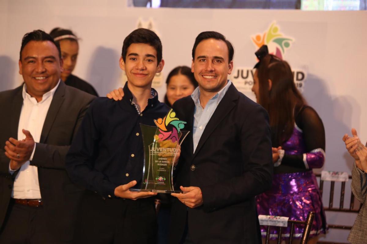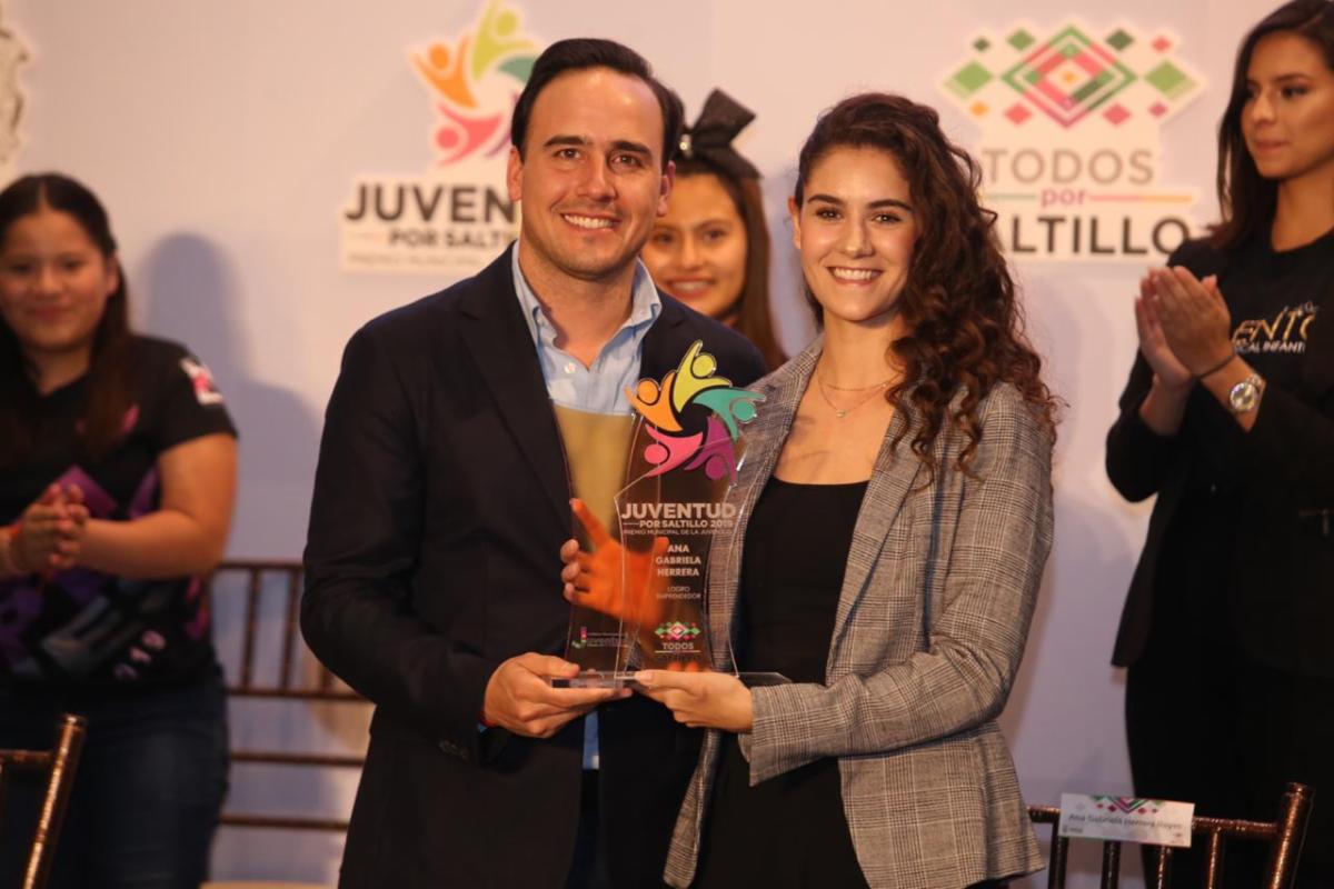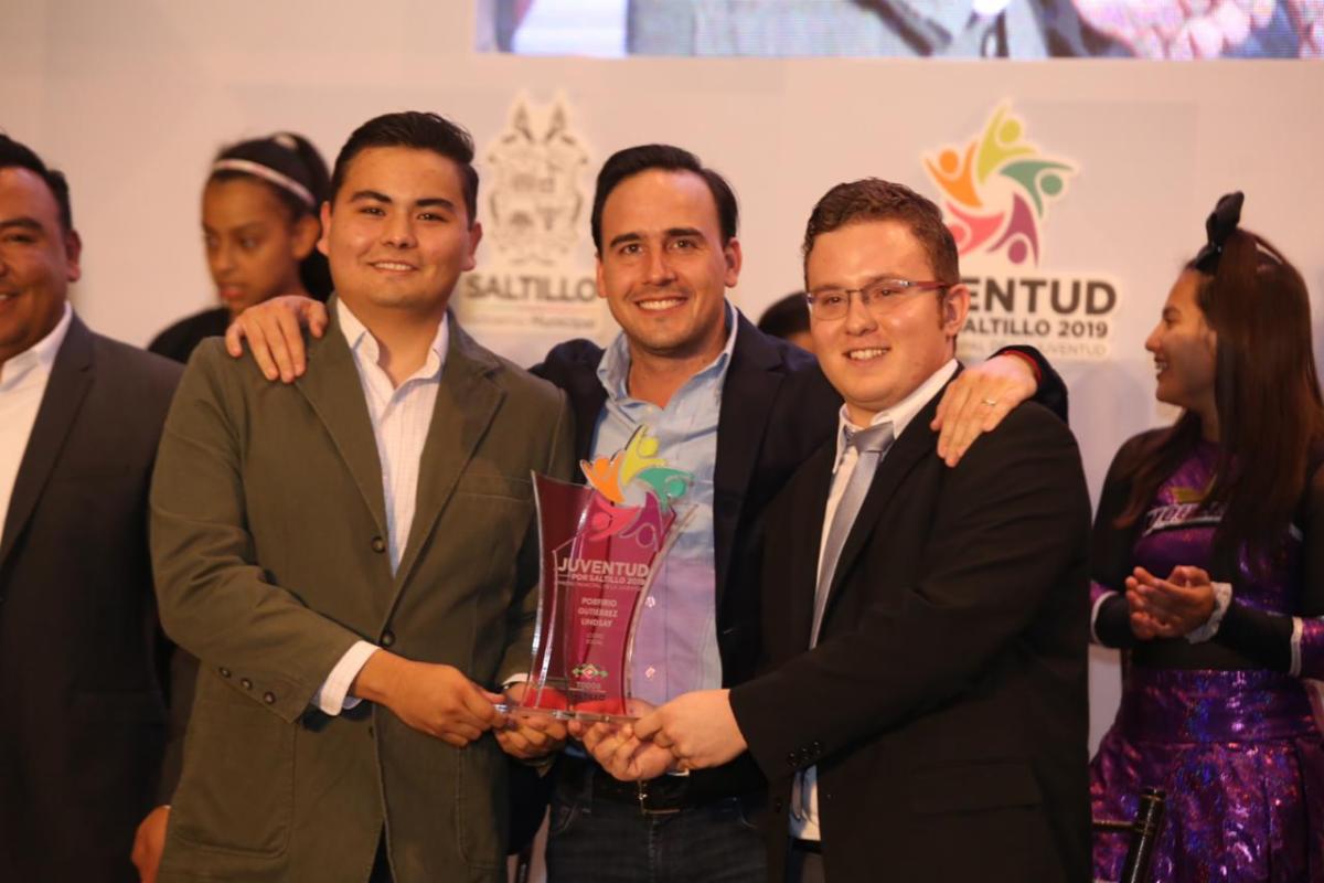 Acompañado por la directora del Instituto Coahuilense de la Juventud, Azalea Maldonado Wong, el Alcalde entregó el premio “Juventud por Saltillo” 2019 a los ganadores en las siguientes categorías: Andrés de la Garza Rosales, en logro académico; Porfirio Gutiérrez Lindsay, logro social; Ana Gabriela Herrera, logro emprendedor.