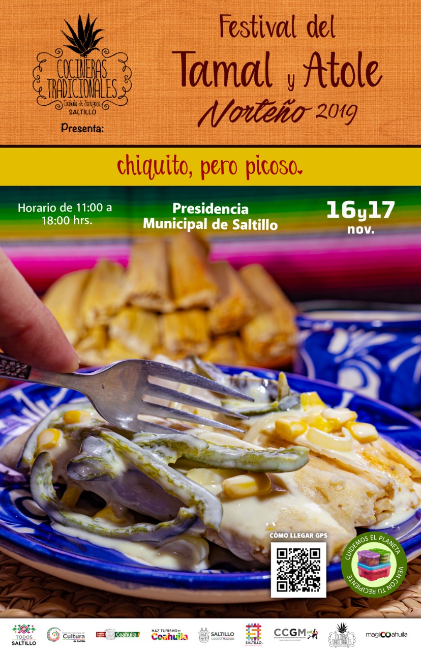 A celebrarse los próximos 16 y 17 de noviembre, a partir de las 11:00 de la mañana y hasta las 6:00 de la tarde, en la Explanada de la Presidencia Municipal de Saltillo, el Festival del Tamal y Atole Norteño 2019, organizado por las Cocineras Tradicionales de la ciudad capital, deleitará a los comensales asistentes con una amplia variedad del platillo y bebida protagonistas.