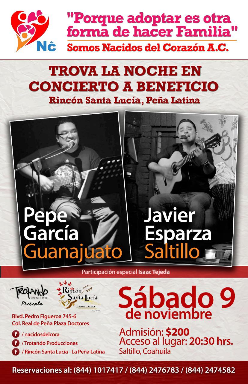 En apoyo a la operatividad de la asociación Somos Nacidos del Corazón, enfocado en brindar orientación a parejas interesadas en adoptar niños en abandono o situación vulnerable y con ello facilitar este proceso, los trovadores Pepe García, de Guanajuato; y Javier Esparza, de Saltillo, ofrecerán en el Rincón Santa Lucía La Peña Latina (Pedro Figueroa 745. Real de Peña), un concierto en el que lo recaudado se destinará íntegramente a este colectivo.