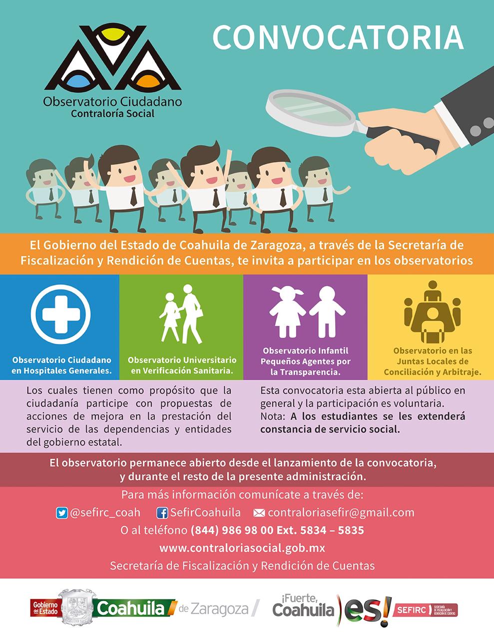 La funcionaria estatal precisó que la SEFIRC hace una atenta invitación a la población en general a sumarse a los observatorios ciudadanos en los Hospitales del Sector Salud, las Juntas de Conciliación y Arbitraje y Acompañamiento Universitario en Verificación Sanitaria, quienes serán denominados observadores ciudadanos, y realizarán encuestas de salida a los usuarios con miras a proponer acciones de mejora en los lugares antes mencionados.