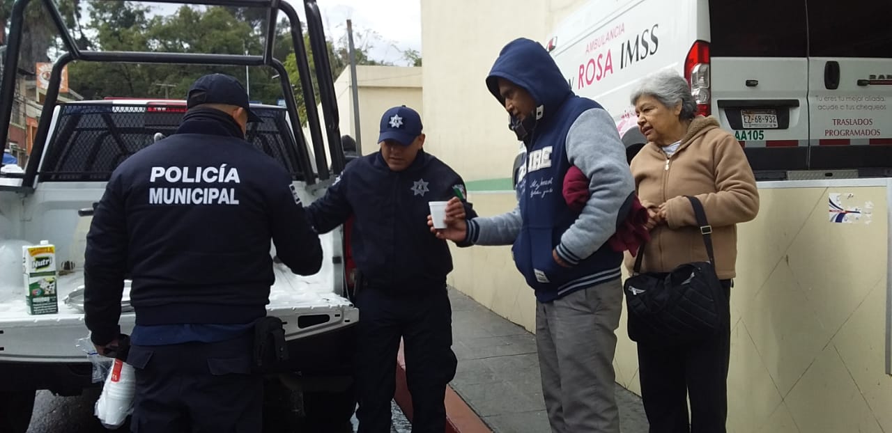 Como parte de las acciones de proximidad social, elementos de las diferentes áreas de la Comisión de Seguridad y Protección Ciudadana acudieron a los centros médicos a brindar bebidas calientes y alimentos a las personas que están a la espera de sus familiares hospitalizados.
