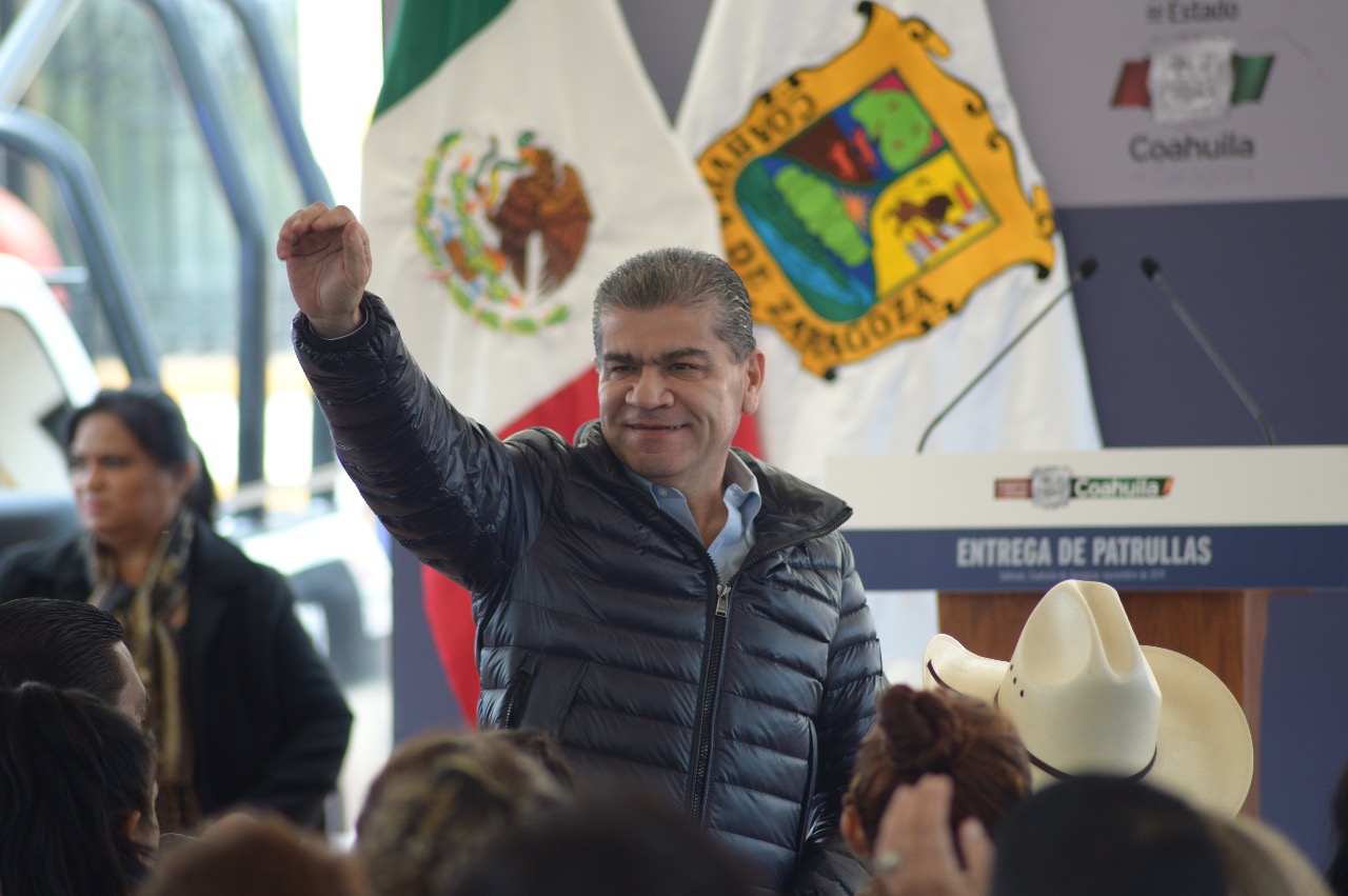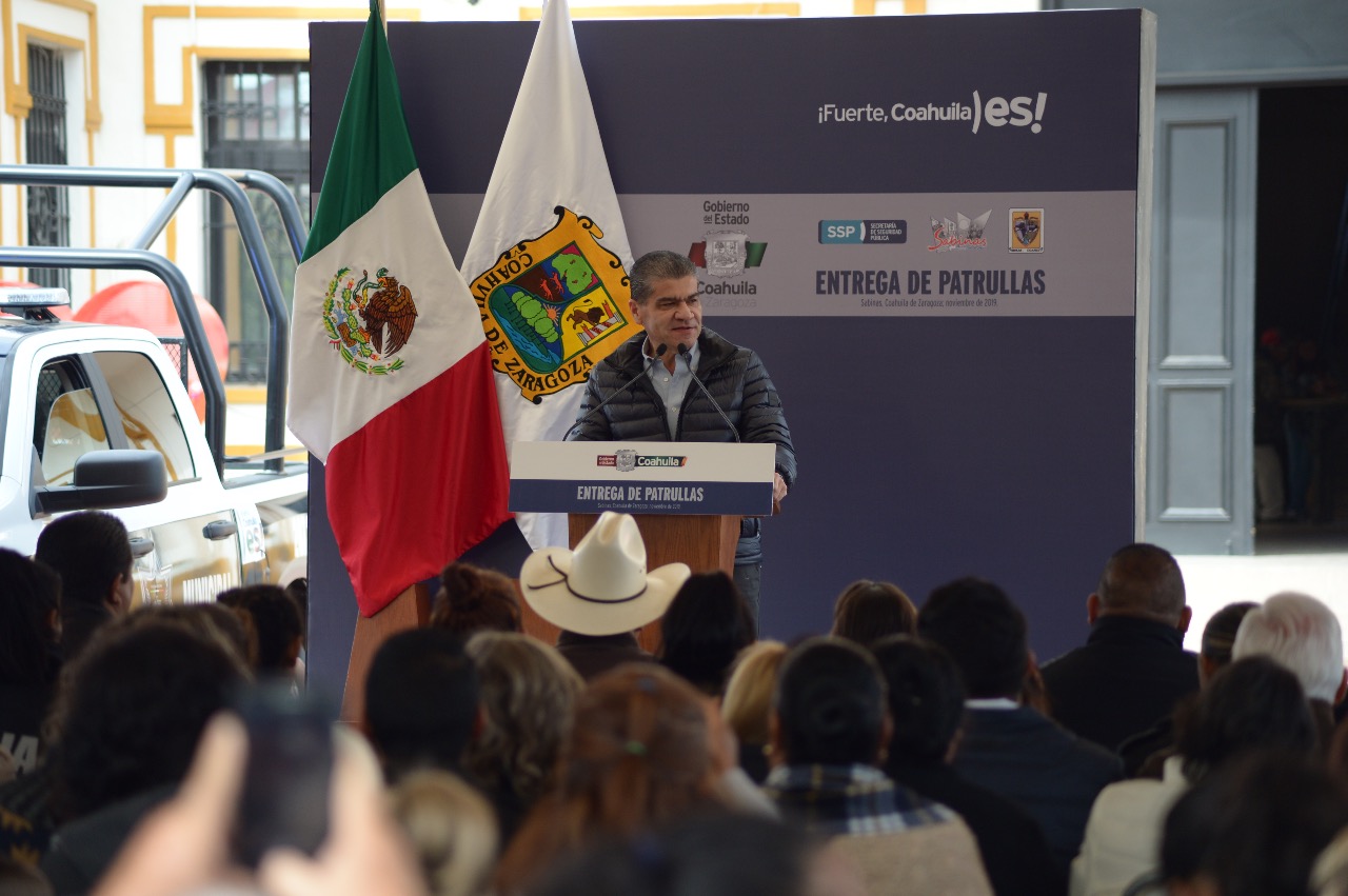 El gobernador Miguel Ángel Riquelme Solís expuso que realiza la última entrega de patrullas a Sabinas.