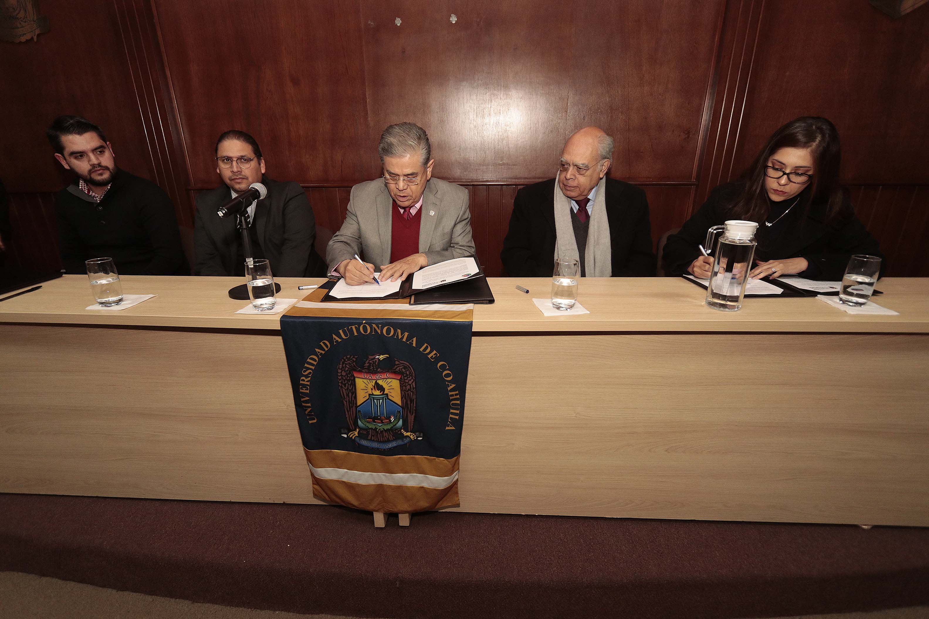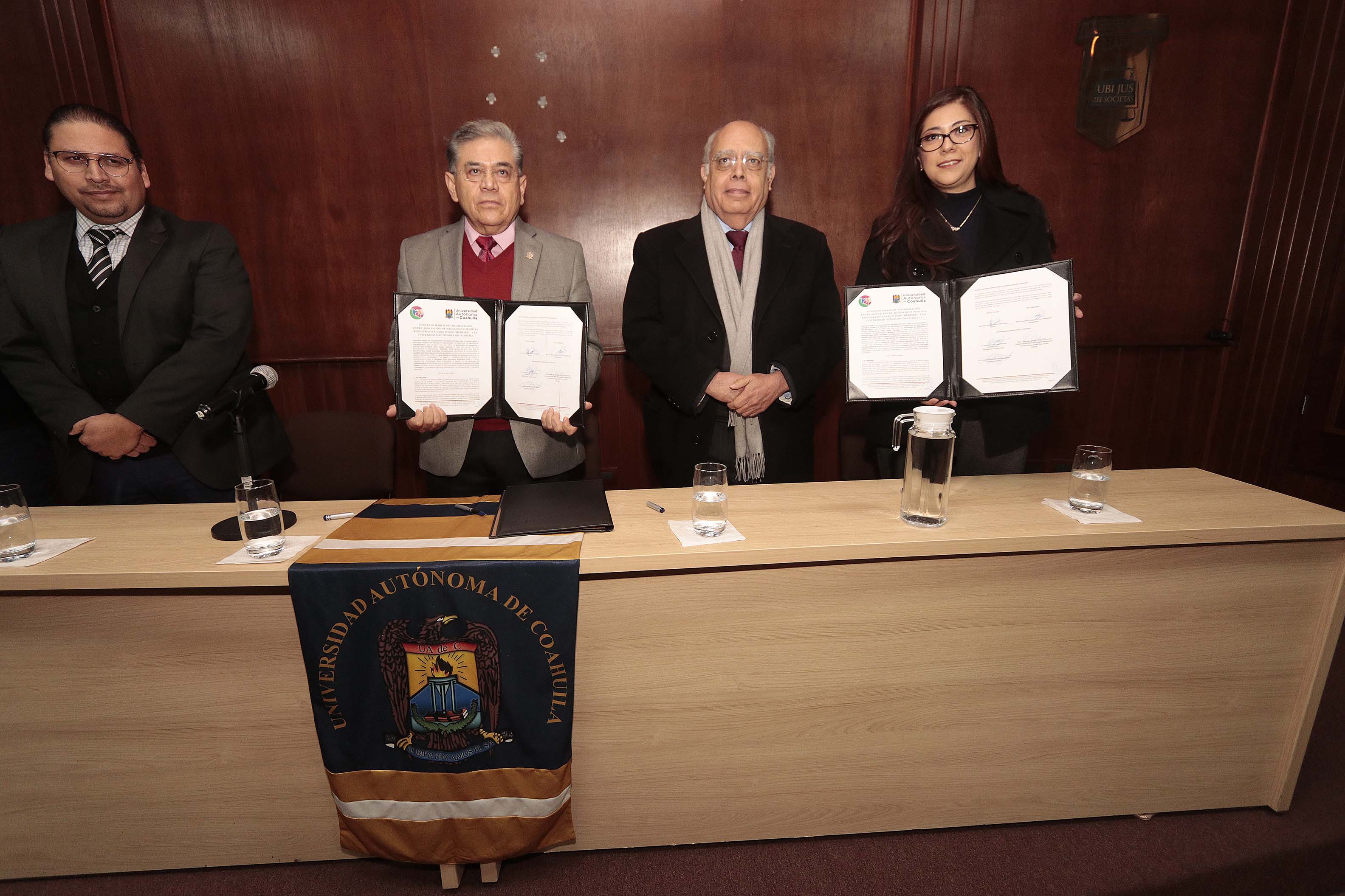 El convenio se signó en la Sala de Proyecciones de la Facultad de Jurisprudencia donde se contó con la presencia del rector de la máxima casa de estudios, Salvador Hernández Vélez, la presidenta de la Asociación “Mediare”, Sara María Guerrero Tecuanhuehue, el coordinador de la Unidad Saltillo, Julio Saucedo Zul y el director de la Facultad de Jurisprudencia, Luis Yáñez Armijo.