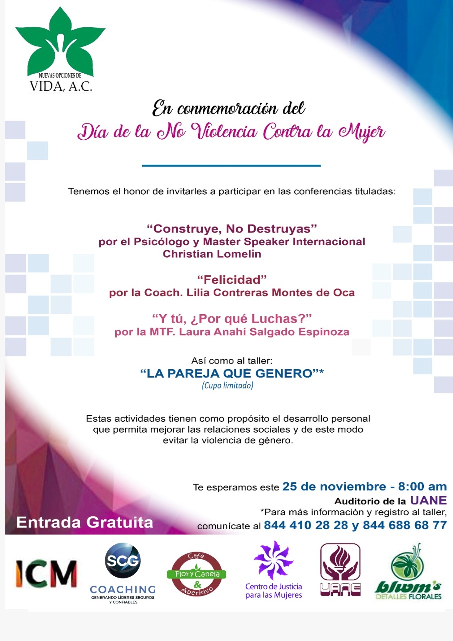 Para conmemorar el Día de la No Violencia Contra la Mujer, la asociación civil Nuevas Opciones de Vida, invita a la comunidad en general a participar en las conferencias gratuitas que tendrán lugar el próximo 25 de noviembre, a partir de las 8:00 de la mañana, en el Auditorio de la Universidad Autónoma del Noreste (UANE).