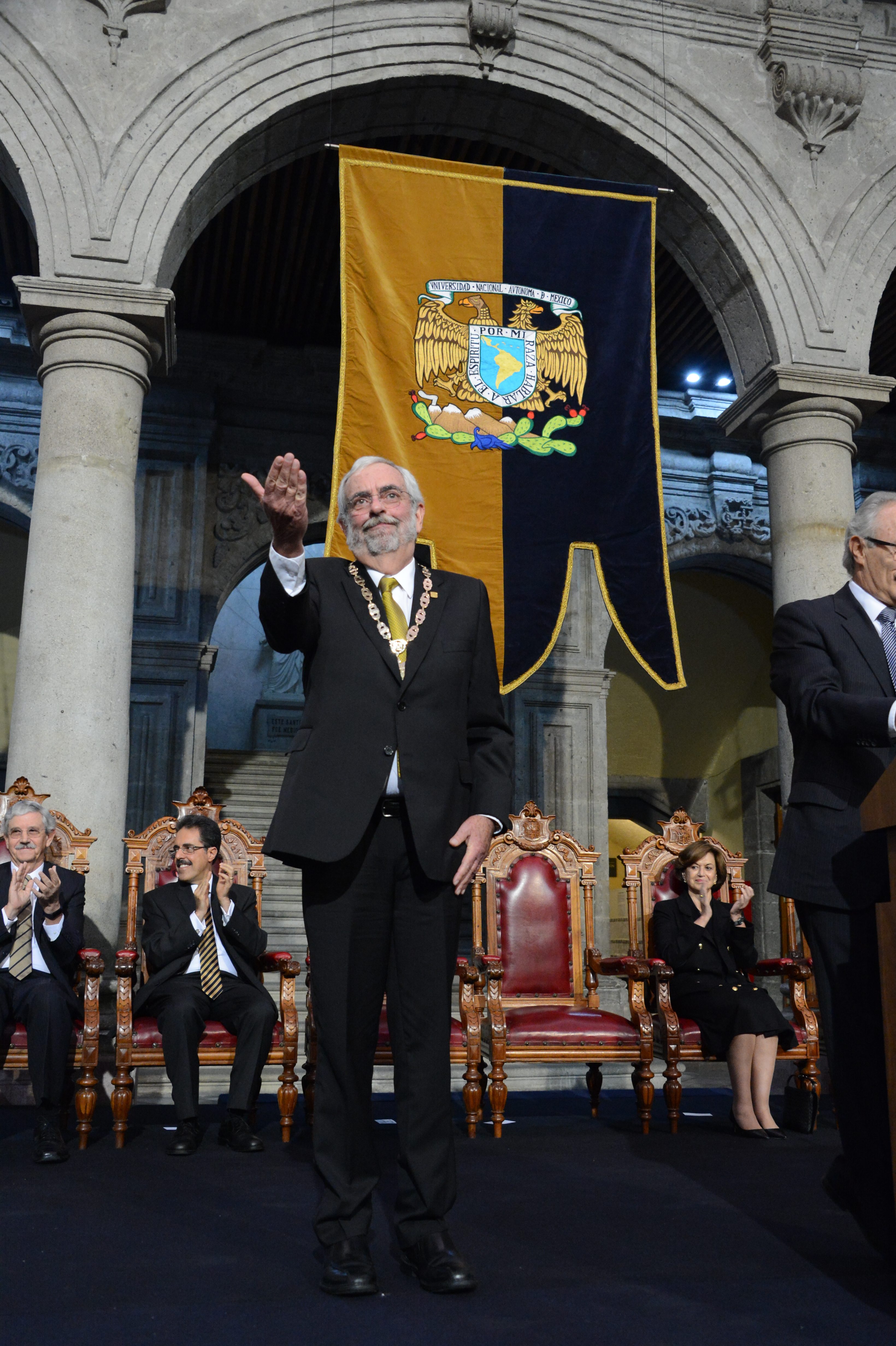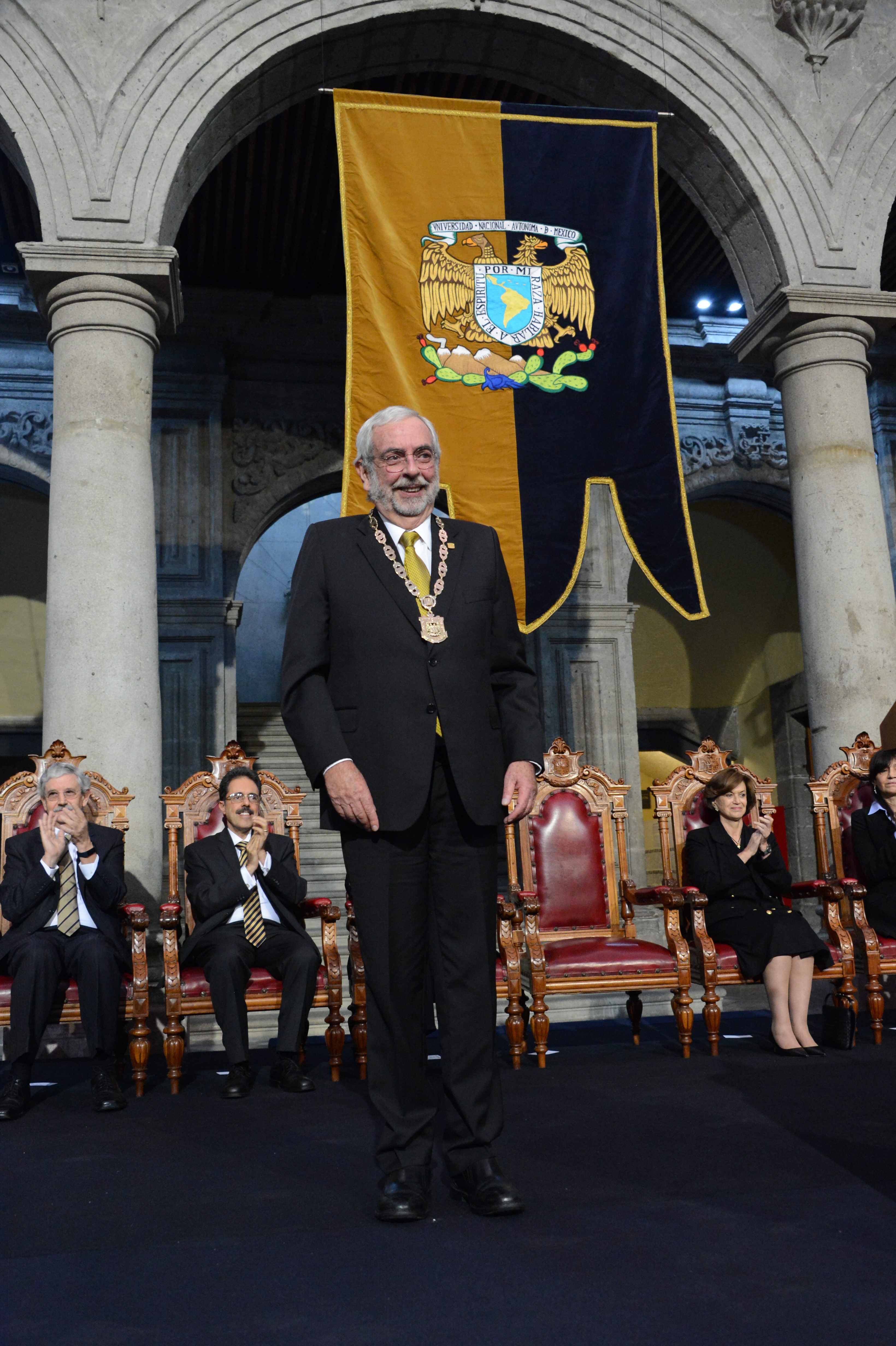 Ante los integrantes de la Junta de Gobierno; la presidenta de la Junta de Patronos, María Elena Vázquez Nava; exrectores; doctores honoris causa; profesores e investigadores eméritos; consejeros universitarios; secretarios de Estado y rectores de diversas instituciones de educación superior, Graue también reiteró su compromiso de velar por los intereses y valores de la Universidad, así como proteger los derechos de sus integrantes.