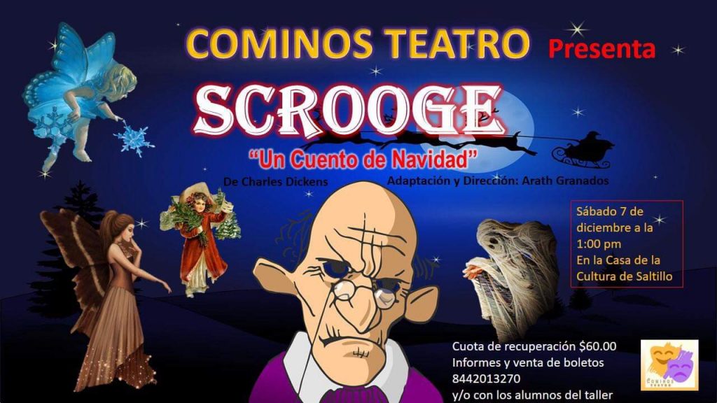 Tomando esta historia y adaptándola para el público local, la Compañía Cominos Teatro, presentará este próximo sábado siete de diciembre, a la 1:00 de la tarde, en la Casa de la Cultura de Saltillo (Hidalgo 359. Centro Histórico), la puesta en escena «Scrooge. Un Cuento de Navidad», con las actuaciones de maestros y alumnos de su taller teatral.