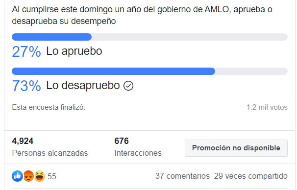Los resultados de éste ejercicio fueron contundentes: de las 1 mil 194 personas que participaron, 869, es decir, el 73% de los encuestados, desaprueban el desempeño del presidente en su primer año de gestión; en tanto que 325 personas, el 27%, opinan que López Obrador si merece una calificación aprobatoria.