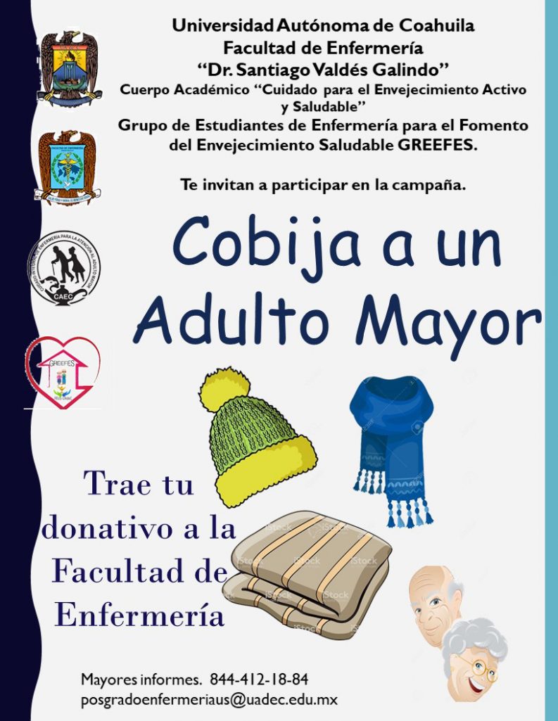 La Facultad de Enfermería «Dr. Santiago Valdés Galindo» de la Universidad Autónoma de Coahuila, convoca a la comunidad universitaria y al público en general a participar en la campaña “Cobija a un Adulto Mayor”.