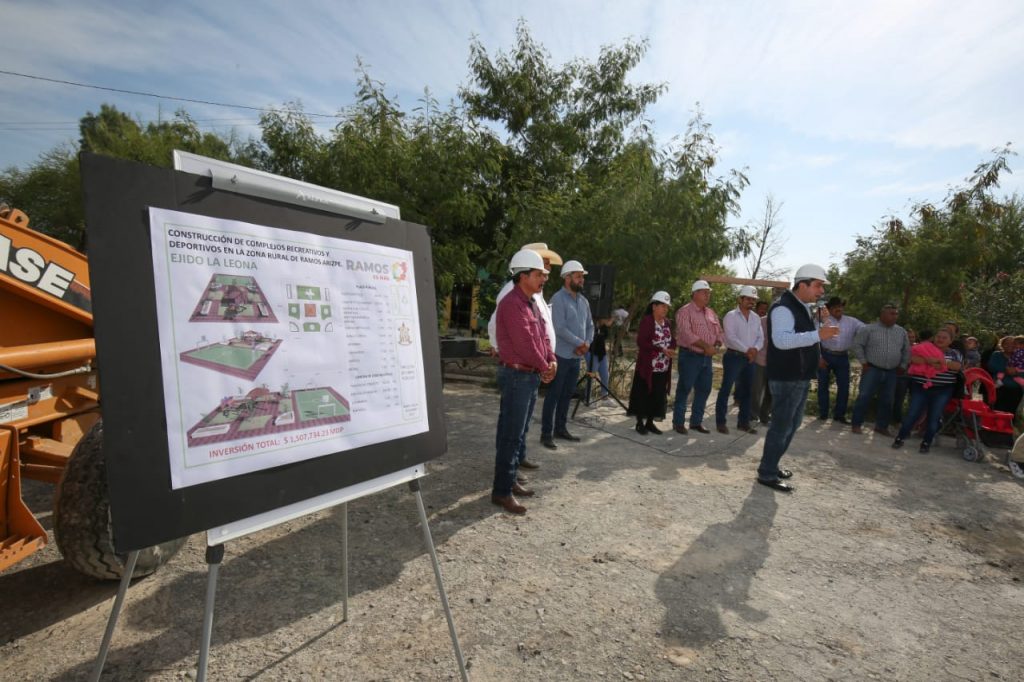 En el ejido la Leona, de Ramos Arizpe, se iniciaron las obras de construcción de complejos recreativos y deportivos, como parte de la agenda del alcalde Chema Morales; de esta manera, el edil acompañado del secretario de Servicios Municipales; Humberto García, secretario de Desarrollo Rural y Omar Limón Lara, director de Obras públicas, dieron el banderazo oficial para comenzar este proyecto que tendrá una inversión total de 1,507,734.23 mdp.