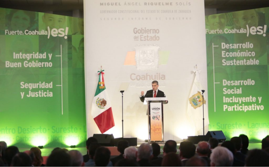 Torreón.- Con motivo de su Segundo Informe, el Gobernador de Coahuila, Miguel Ángel Riquelme Solís, ofreció un mensaje en el Centro de Convenciones de Torreón (CCT), donde ratificó que es la unión de todas y todos la que hace fuerte a la entidad.