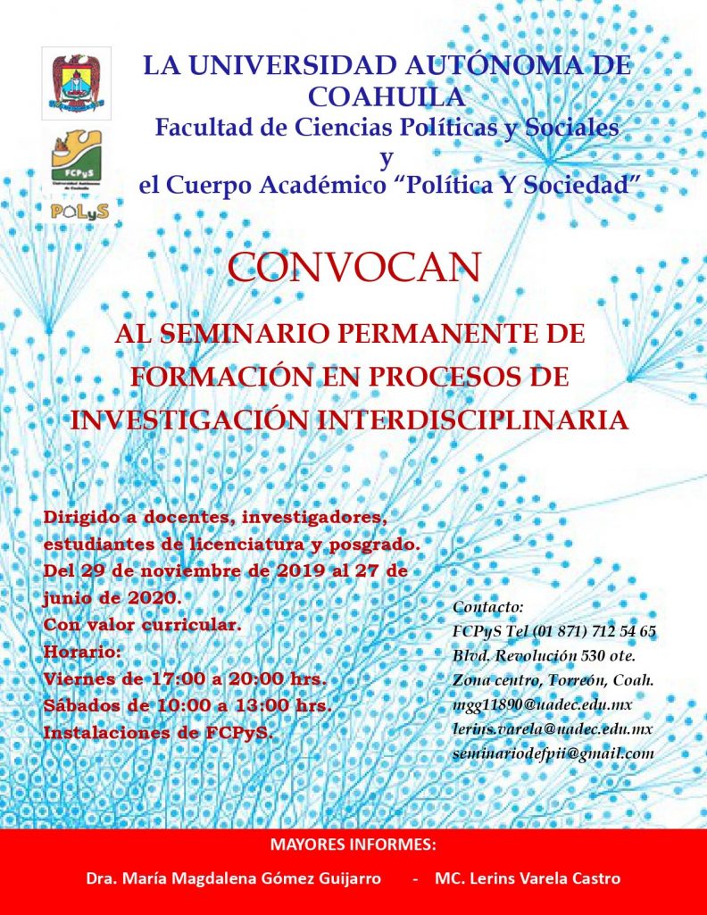Torreón.- La Universidad Autónoma de Coahuila a través de la Facultad de Ciencias Políticas y Sociales de la Unidad Torreón convocan a cursar el “Seminario Permanente de Formación en Procesos de Investigación Interdisciplinaria”.