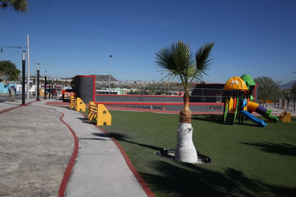 El alcalde de Ramos, Arizpe Chema Morales, acompañado del secretario del ayuntamiento, Alejandro Gonzáles Farías, el secretario de desarrollo social, Tomás Gutiérrez, el director de obras públicas Omar Limón Lara, síndicos y regidores del ayuntamiento hicieron entrega de la primer plaza pública rehabilitada del programa de rehabilitación de plazas y canchas del municipio, ubicada en el boulevard Escorial y Valle Poniente.
