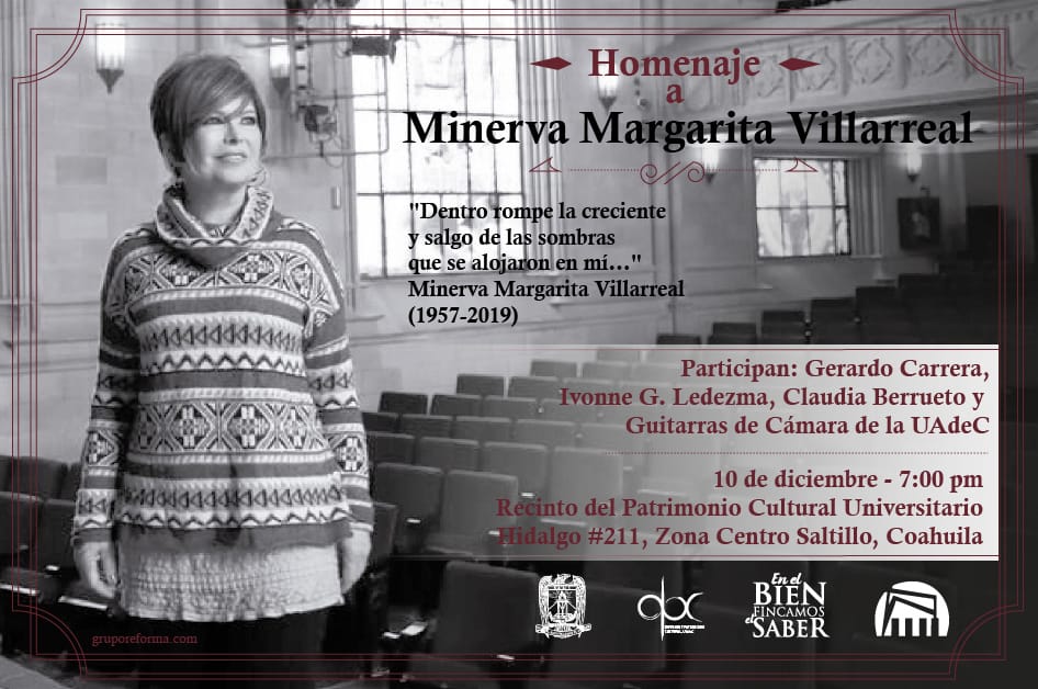 El próximo 10 de diciembre, a las 7:00 de la tarde, en el Recinto del Patrimonio Cultural Universitario (Hidalgo 211), los autores literarios Claudia Berrueto, Ivonne G. Ledezma y Gerardo Carrera, rendirán un homenaje a la también escritora Minerva Margarita Villarreal, quien falleció a los 62 años el pasado 20 de noviembre de este 2019.